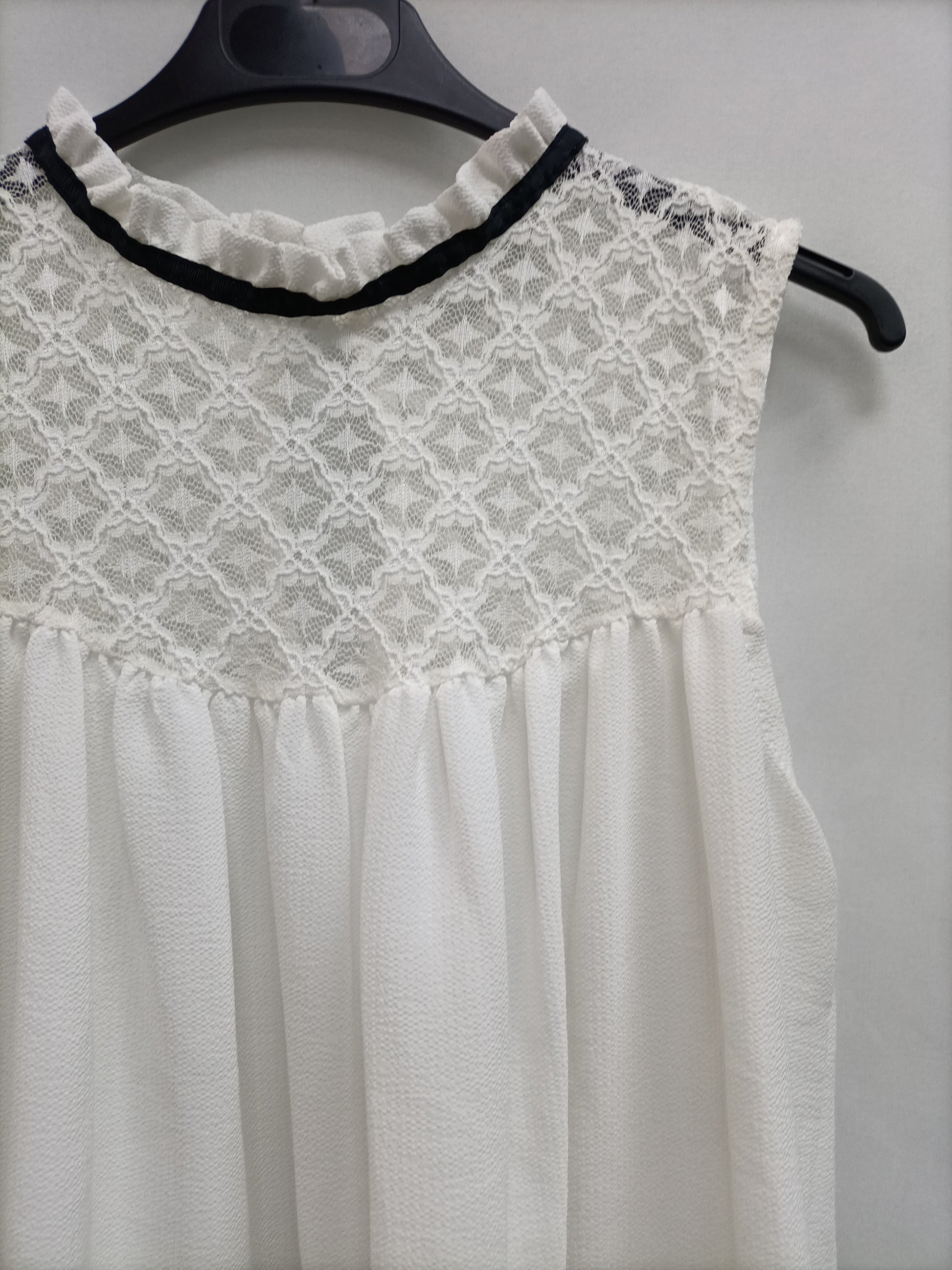 top blanco con escote de encaje. de sisa a sisa 55 cm largo 57 cm.