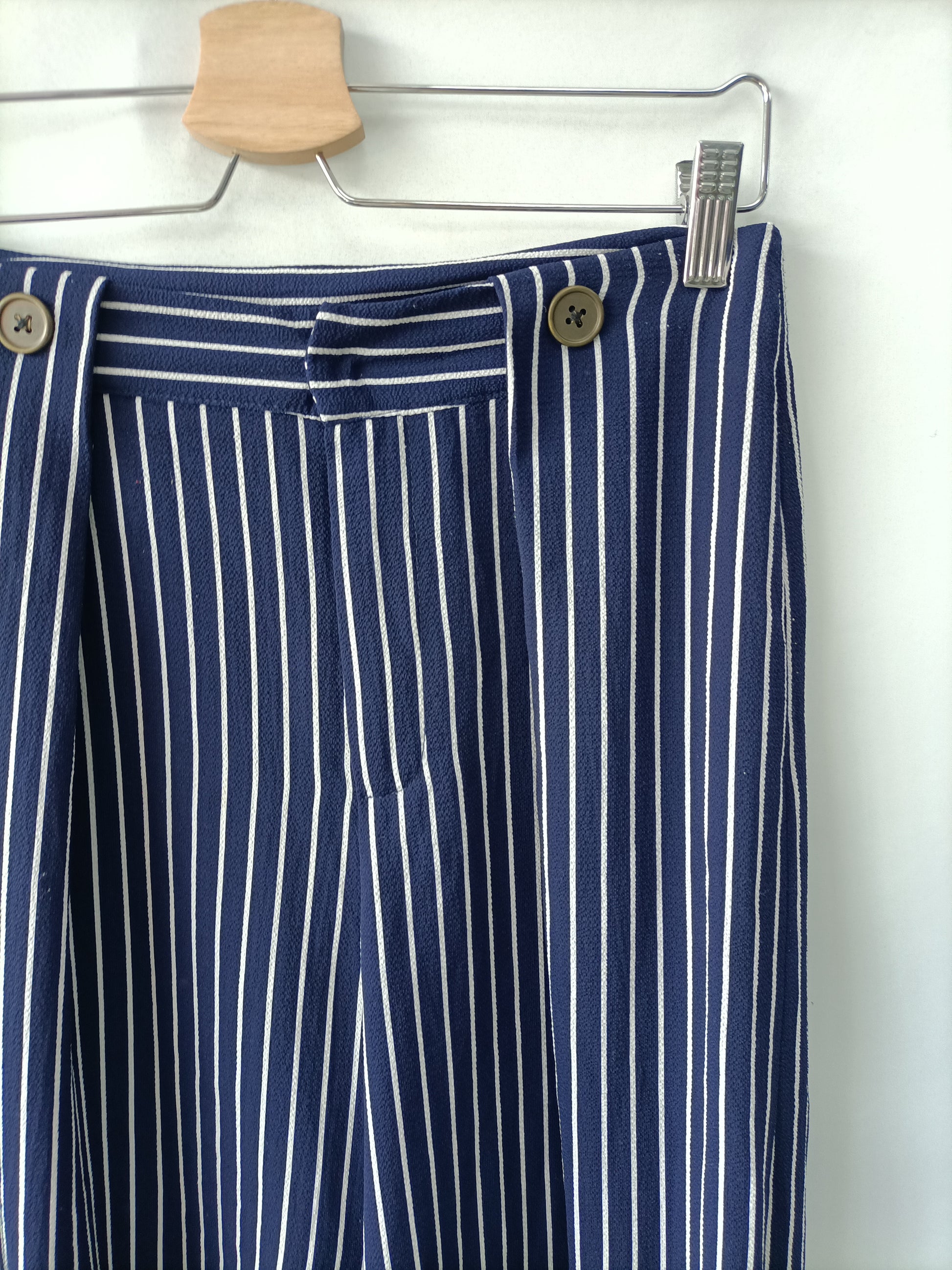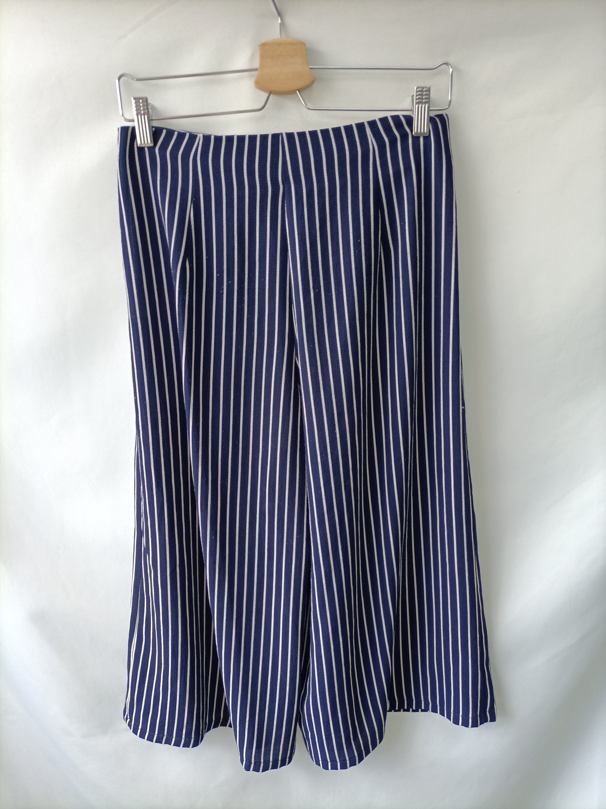 Okeysi. Pantalón azul con rayas blancas. Fluido, largo por la rodilla. Elástico. Cintura 38 cm largo 76 cm