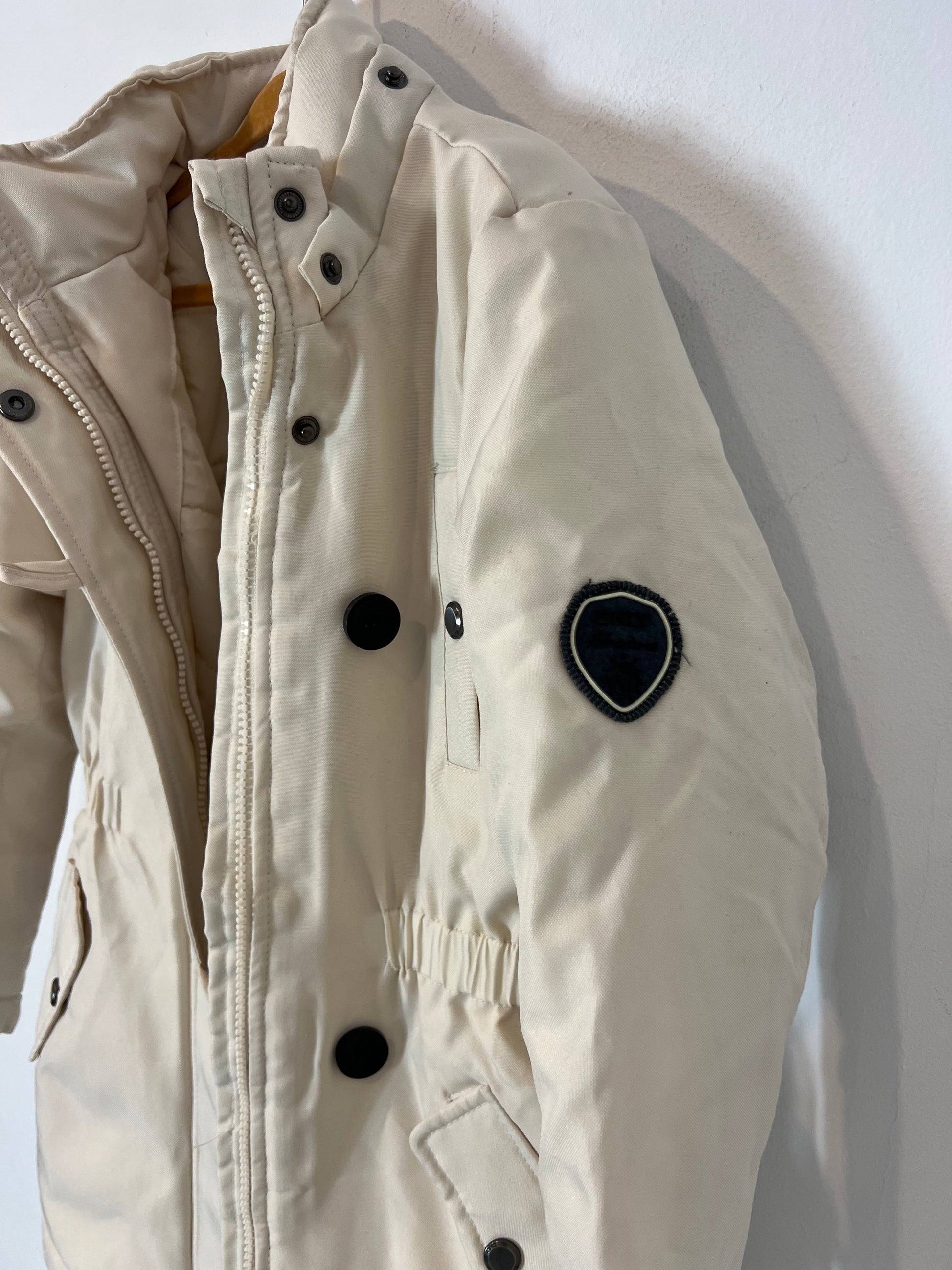 NUEVO CON ETIQUETA. Abrigo color crudo bolsillos. Le falta la capucha. Largo 62cm