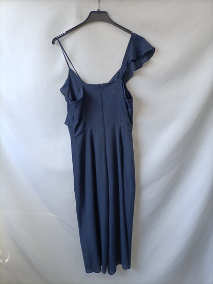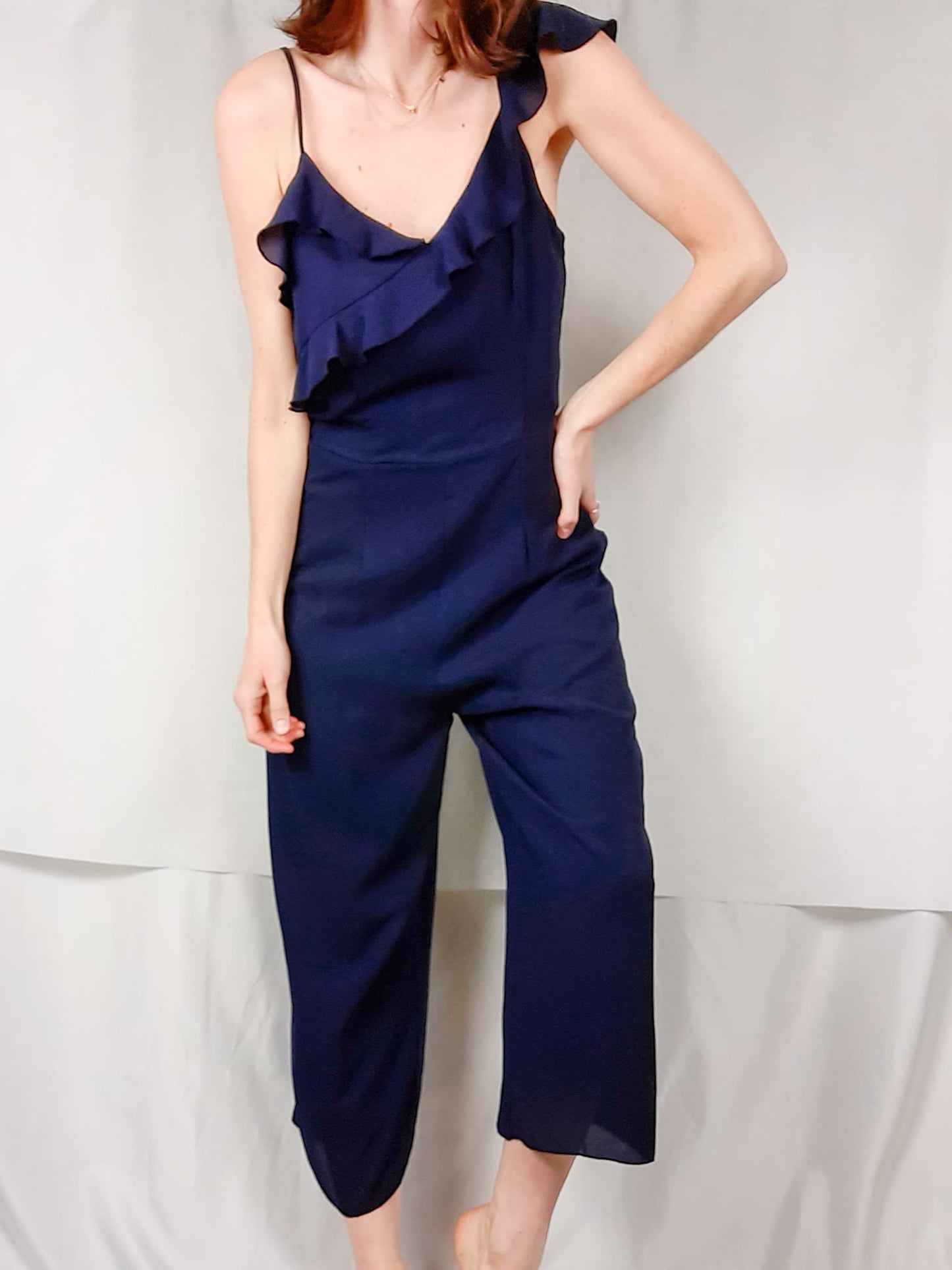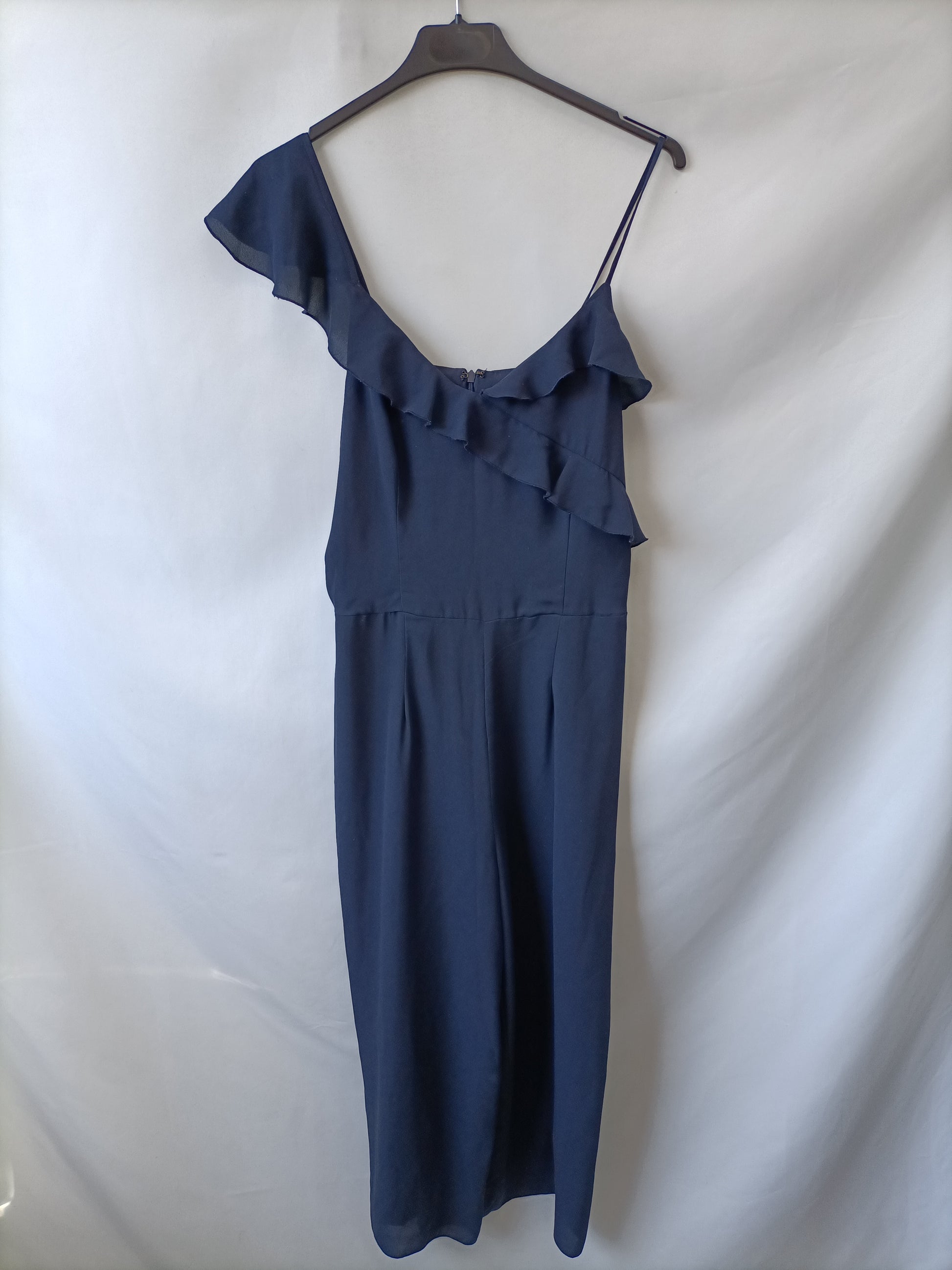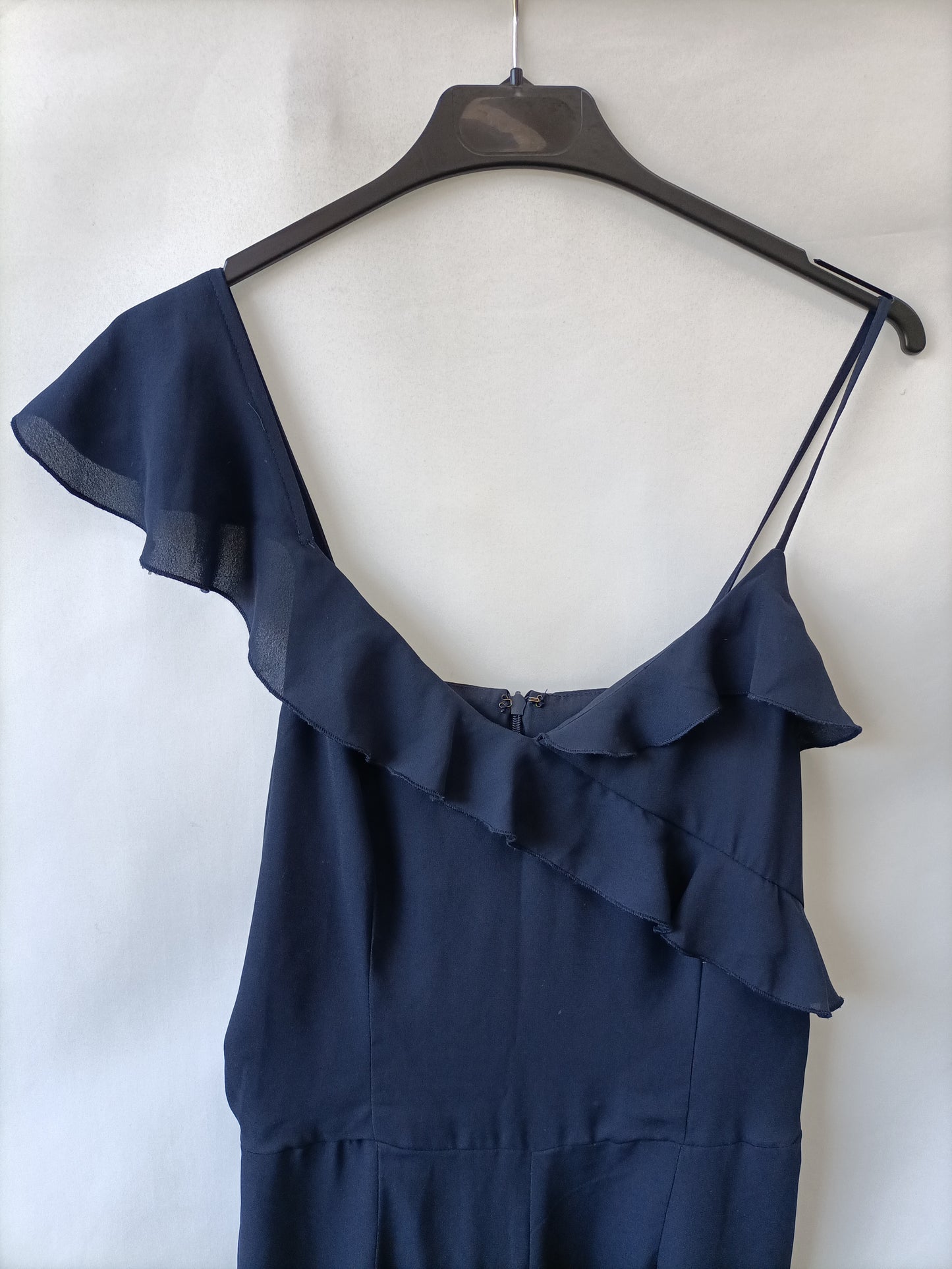 Mono azul culotte con volantes. No elástico. Cremallera trasera. De sisa a sisa 45 cm, cintura 36 cm largo 126 cm