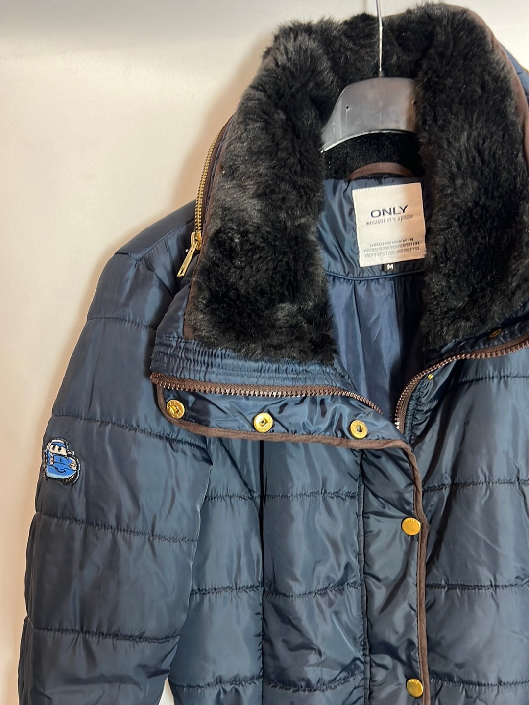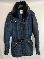 pluma azul con cinturón cuello con interior de pelito y detalles en marrón