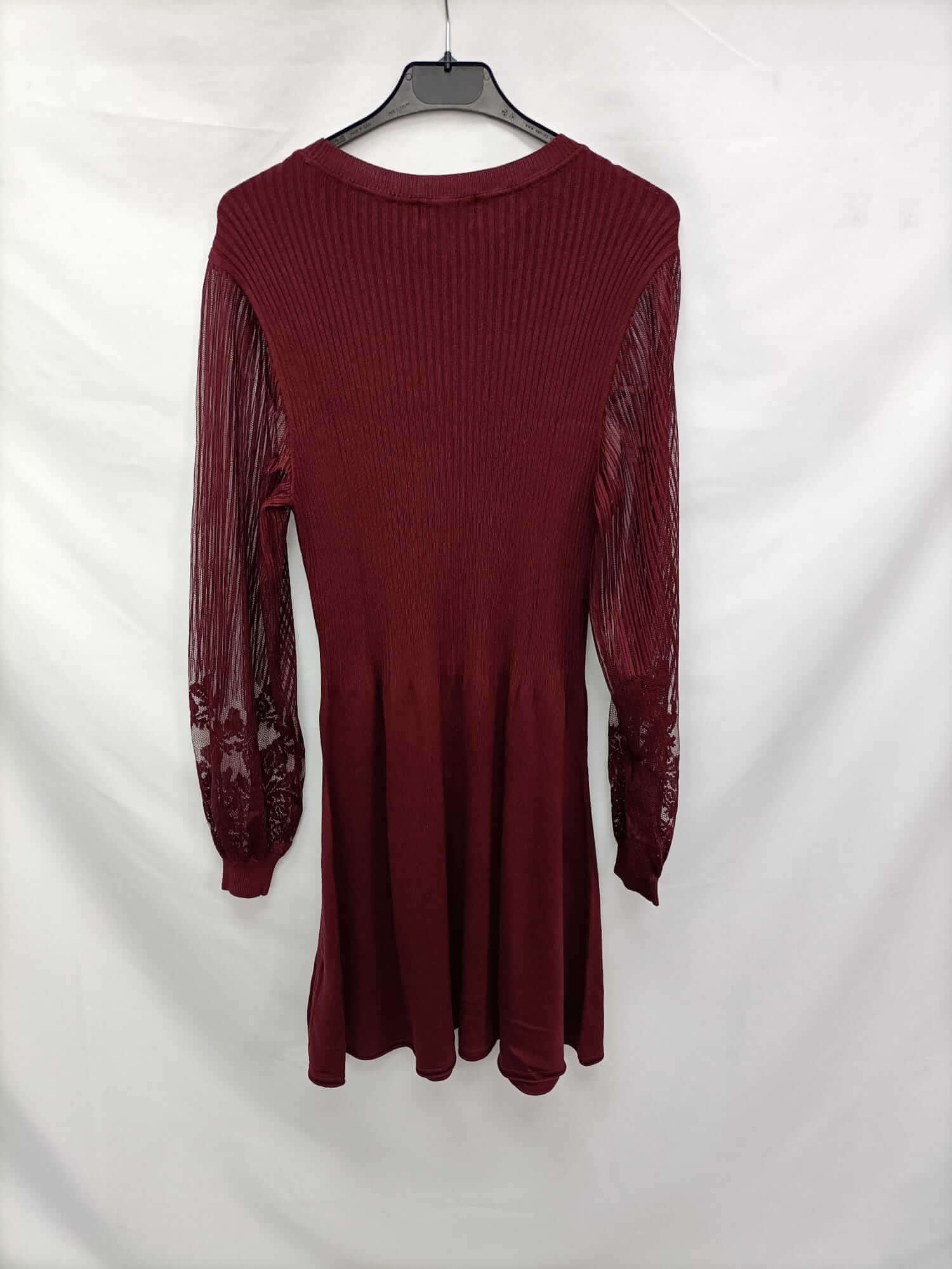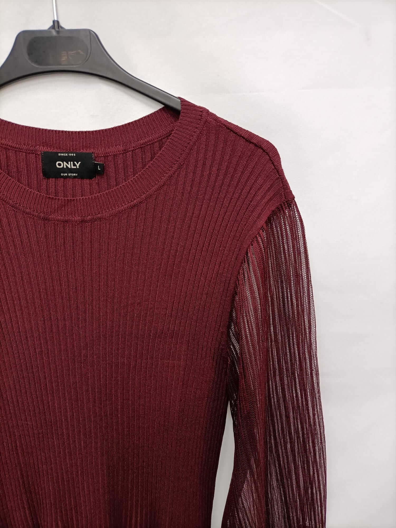 Only. L. Vestido de punto burdeos con las mangas semitransparentes de rejilla y encaje. Elastico. Largo 93 cm