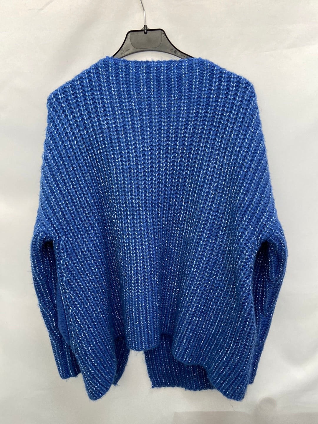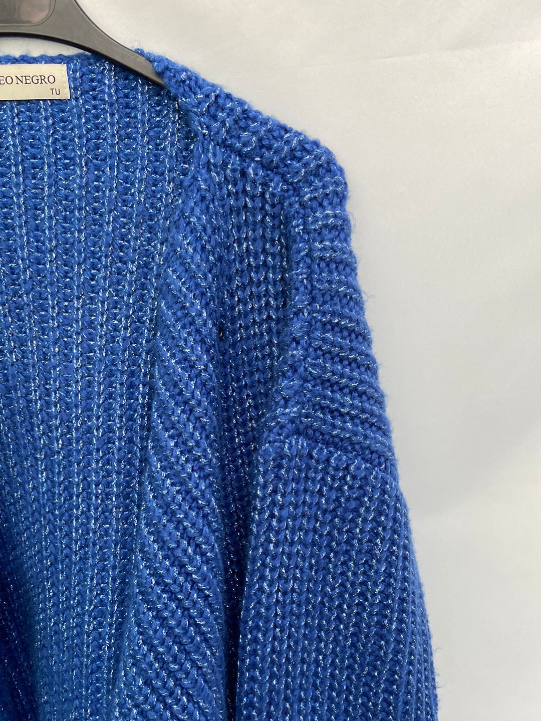 Chaqueta de punto azul con hilos en plateado. Solapas en pico. Unico botón superior para abrochar.
