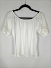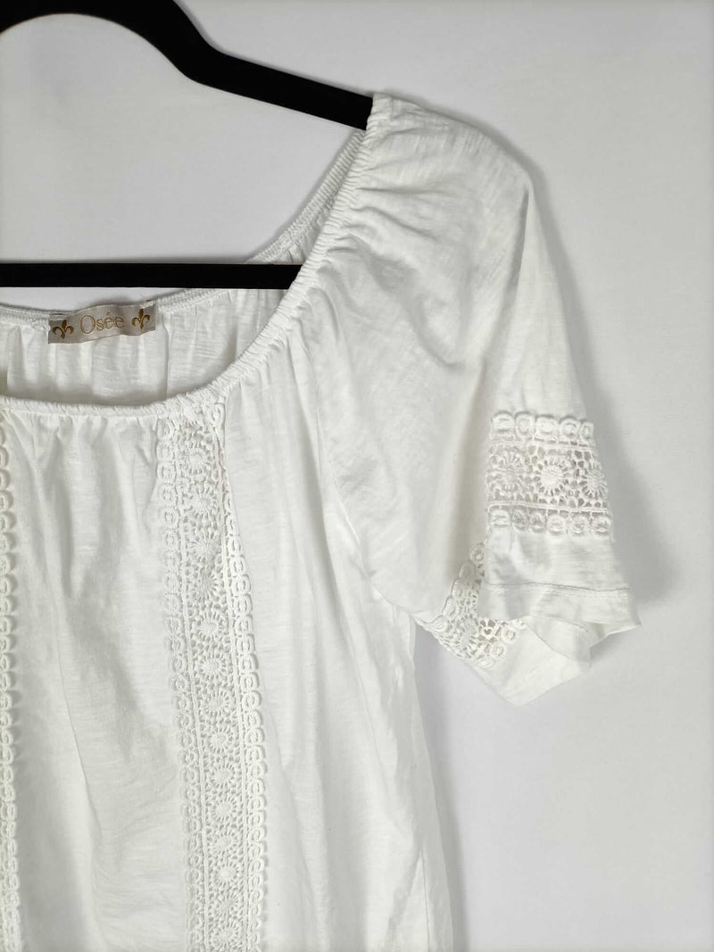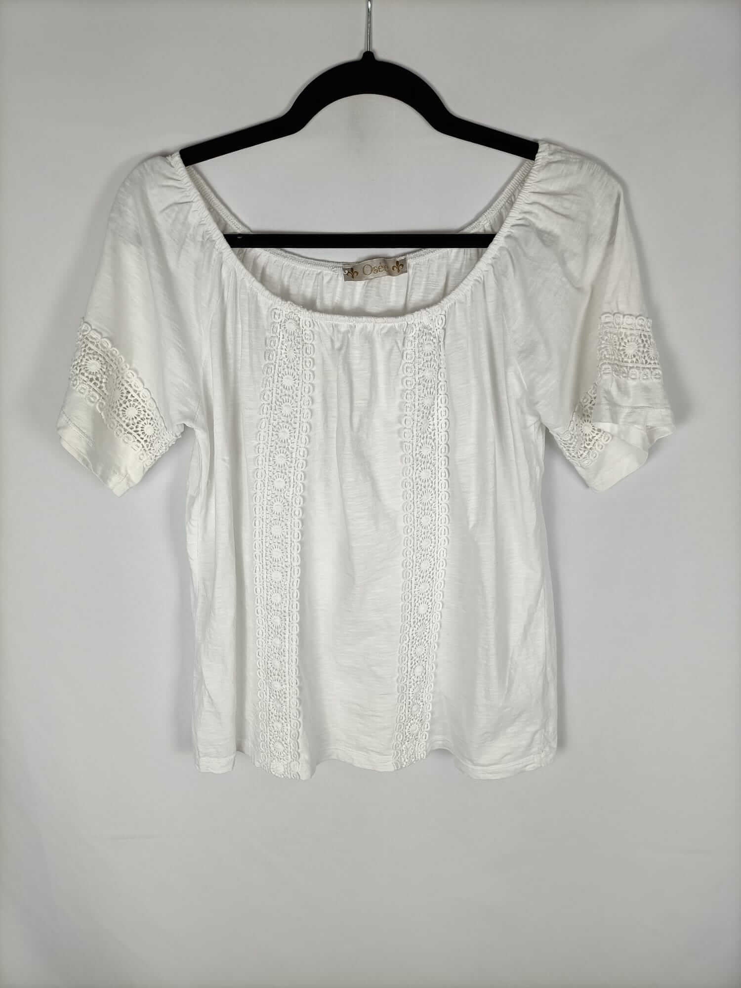 Osée. Tu. Camiseta blanca cuello barco con detalle de encaje. Fluida elástica. Largo de 58 cm