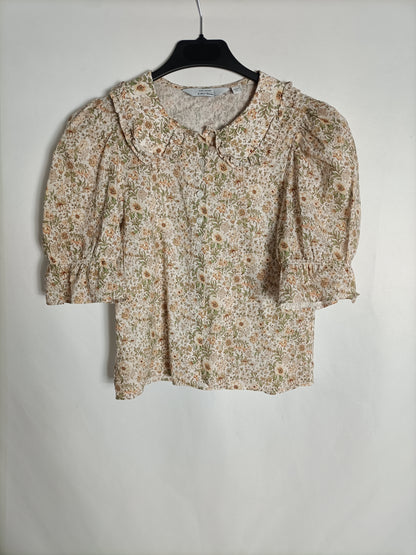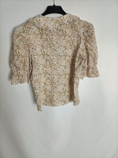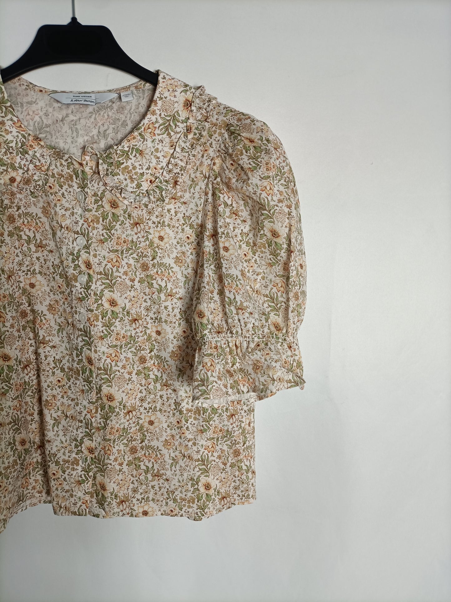 blusa beige flores en tonos teja y verde. de sisa a sisa 40 cm