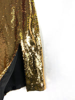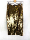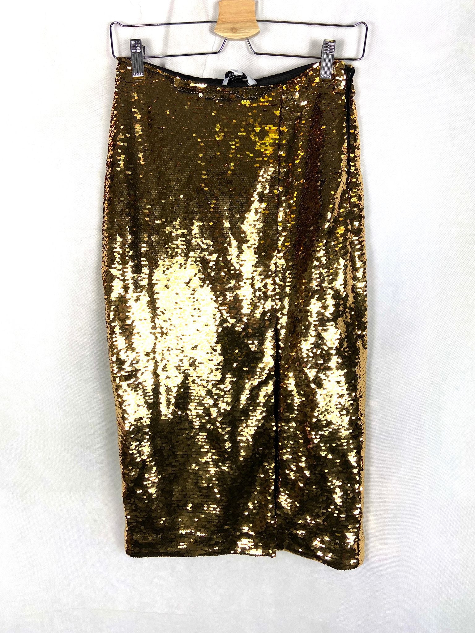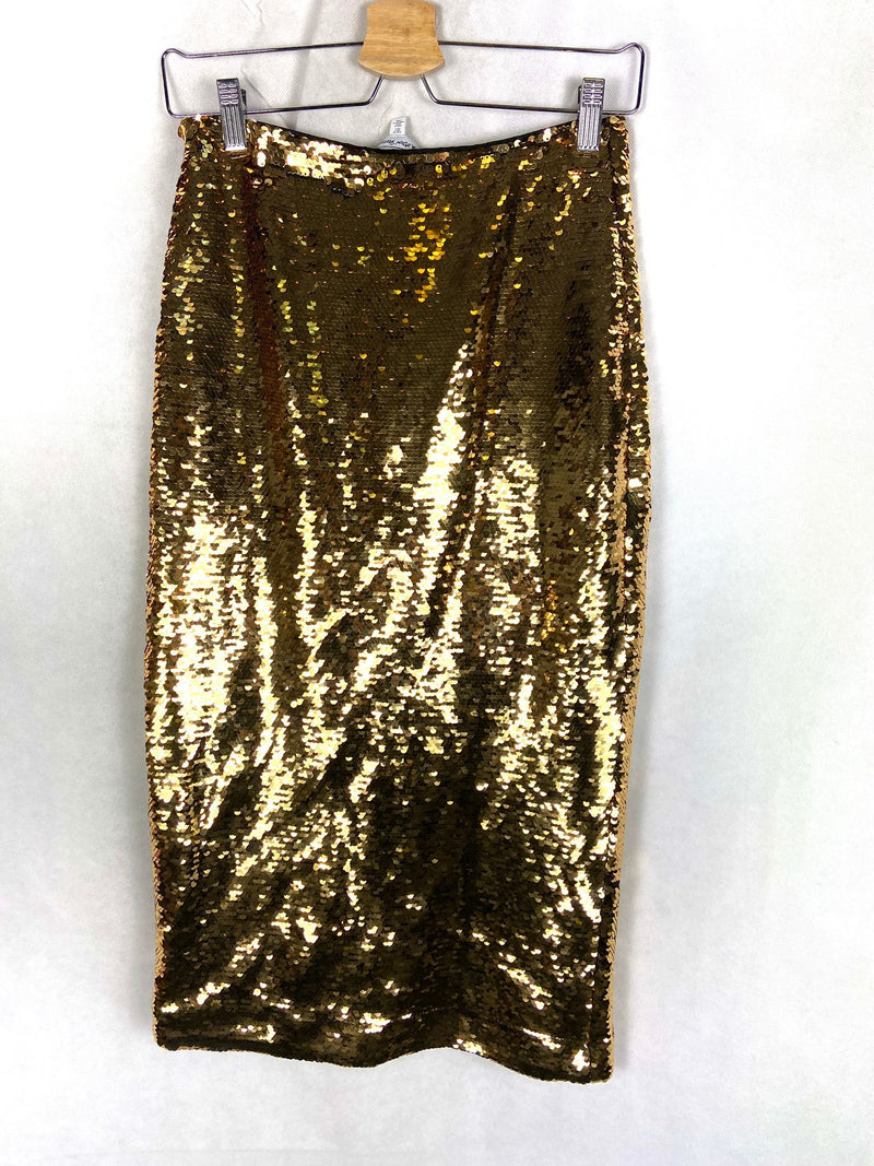 Falda midi lentejuelas doradas con apertura en el lateral. Semielastica con cremallera. Largo 85 cm