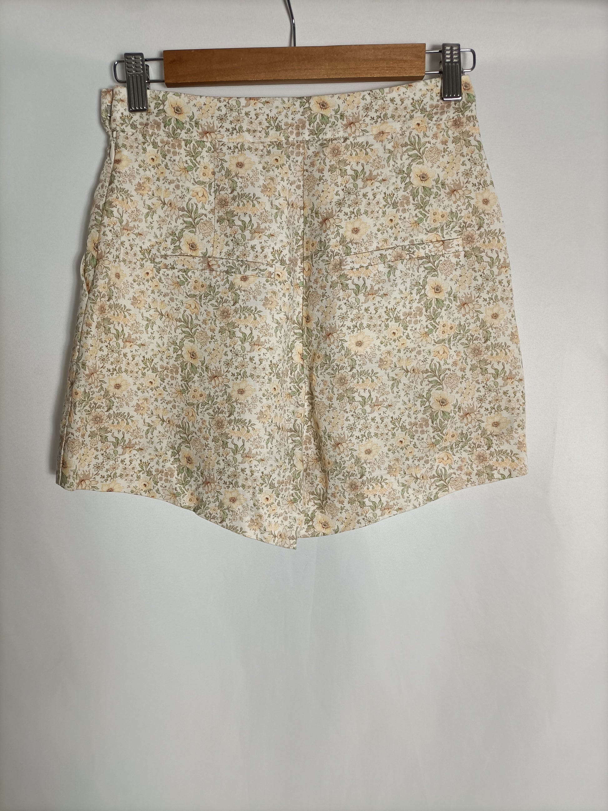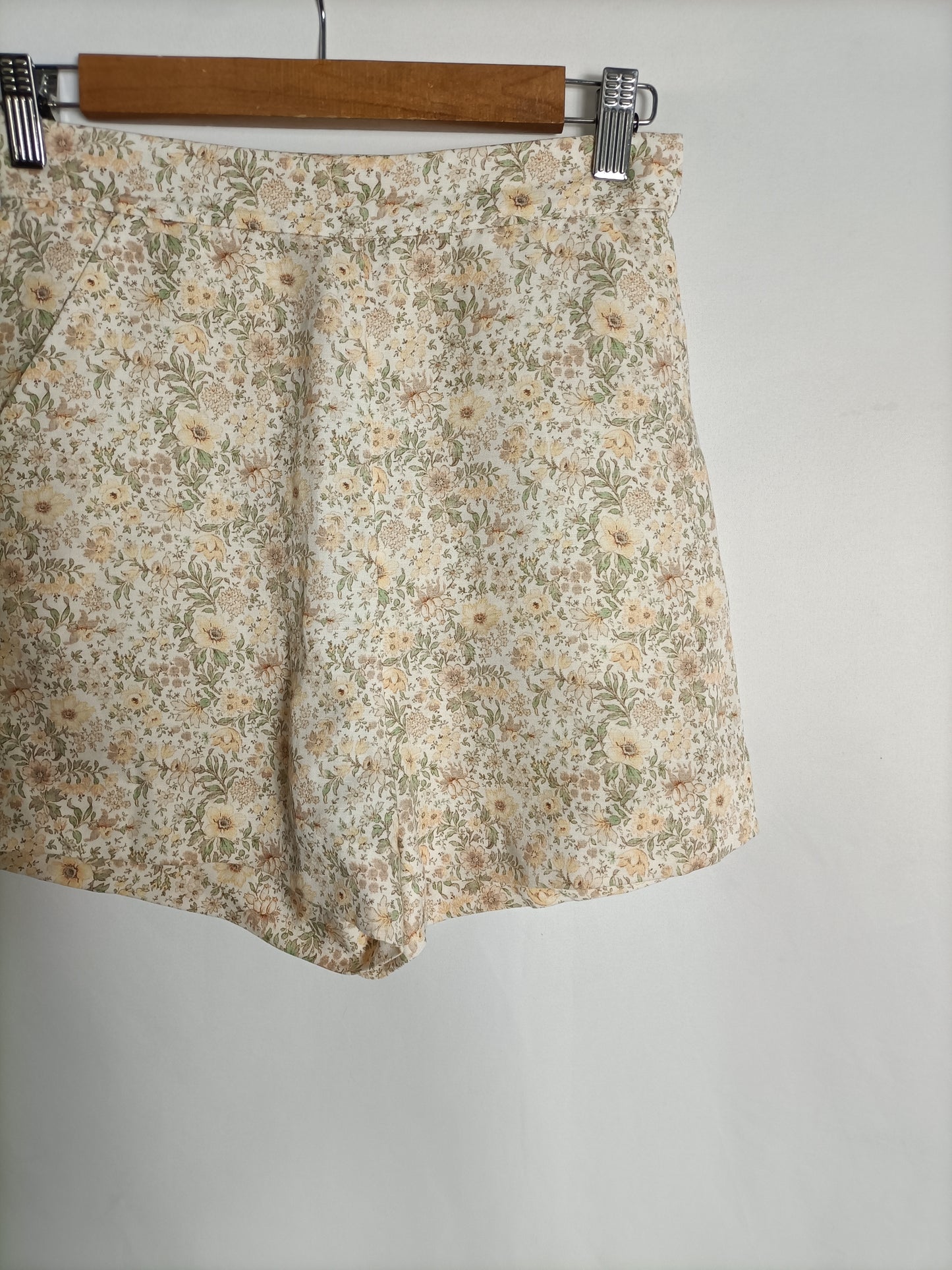 pantalón corto beige flores en tonos teja y verde. cintura 34cm