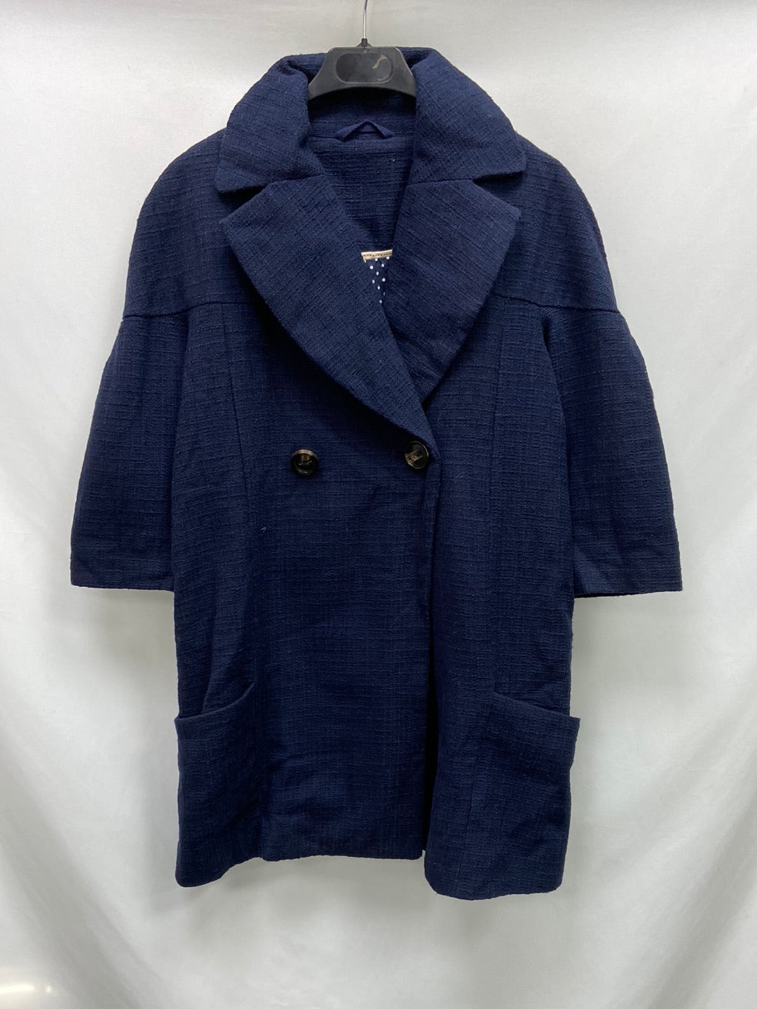 Abrigo azul marino botones cruzado, mangas 3/4. largo 79 cm.