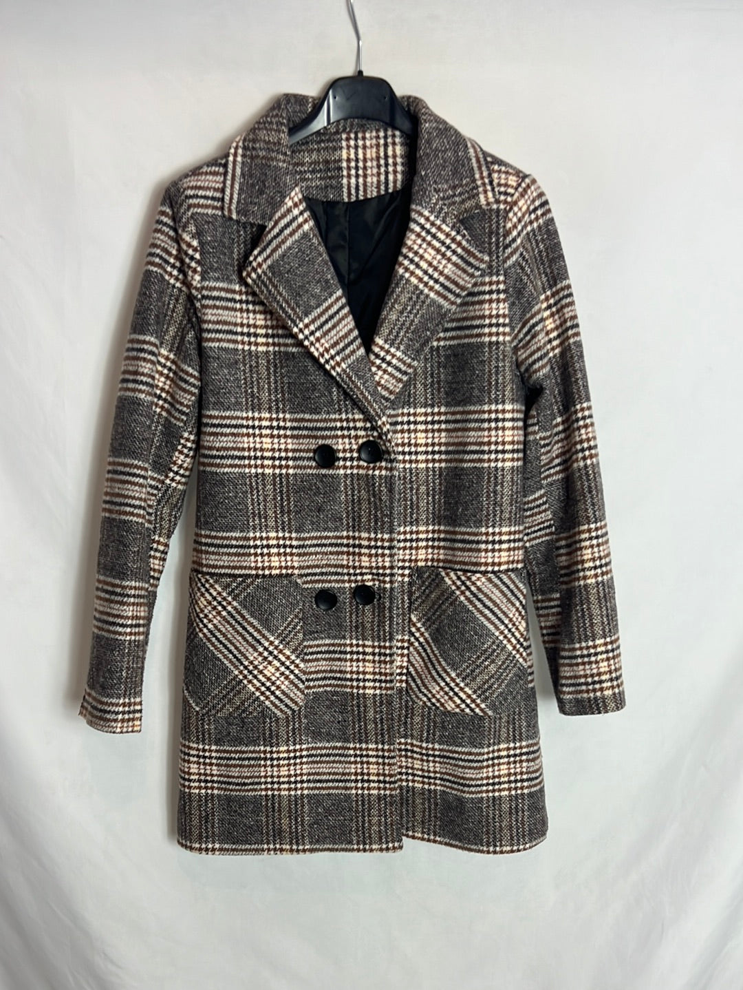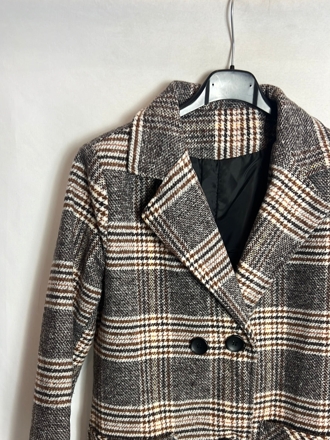 abrigo estilo blazer de cuadros en tonos tierra . Hombros 36cm, largo 77cm