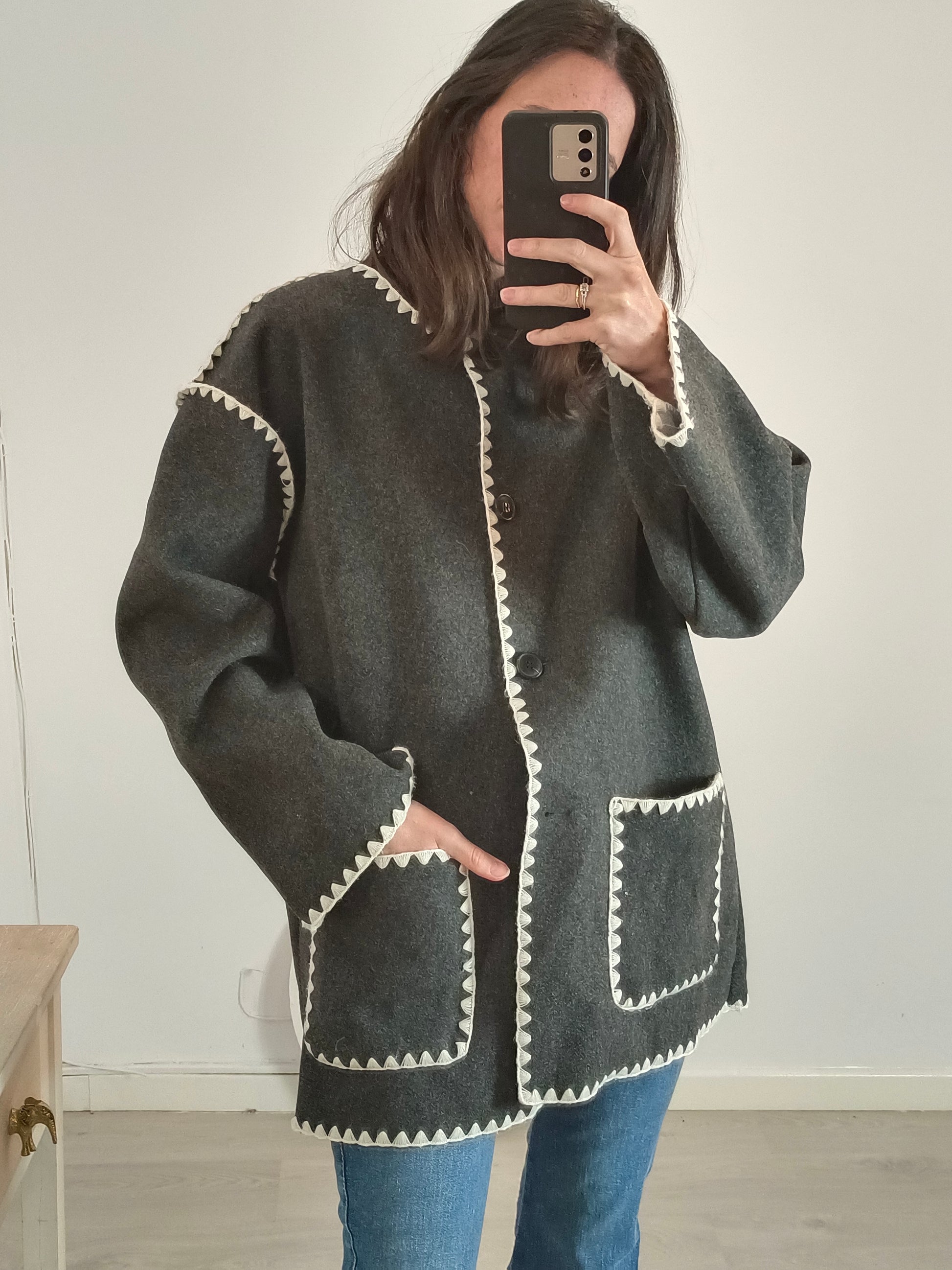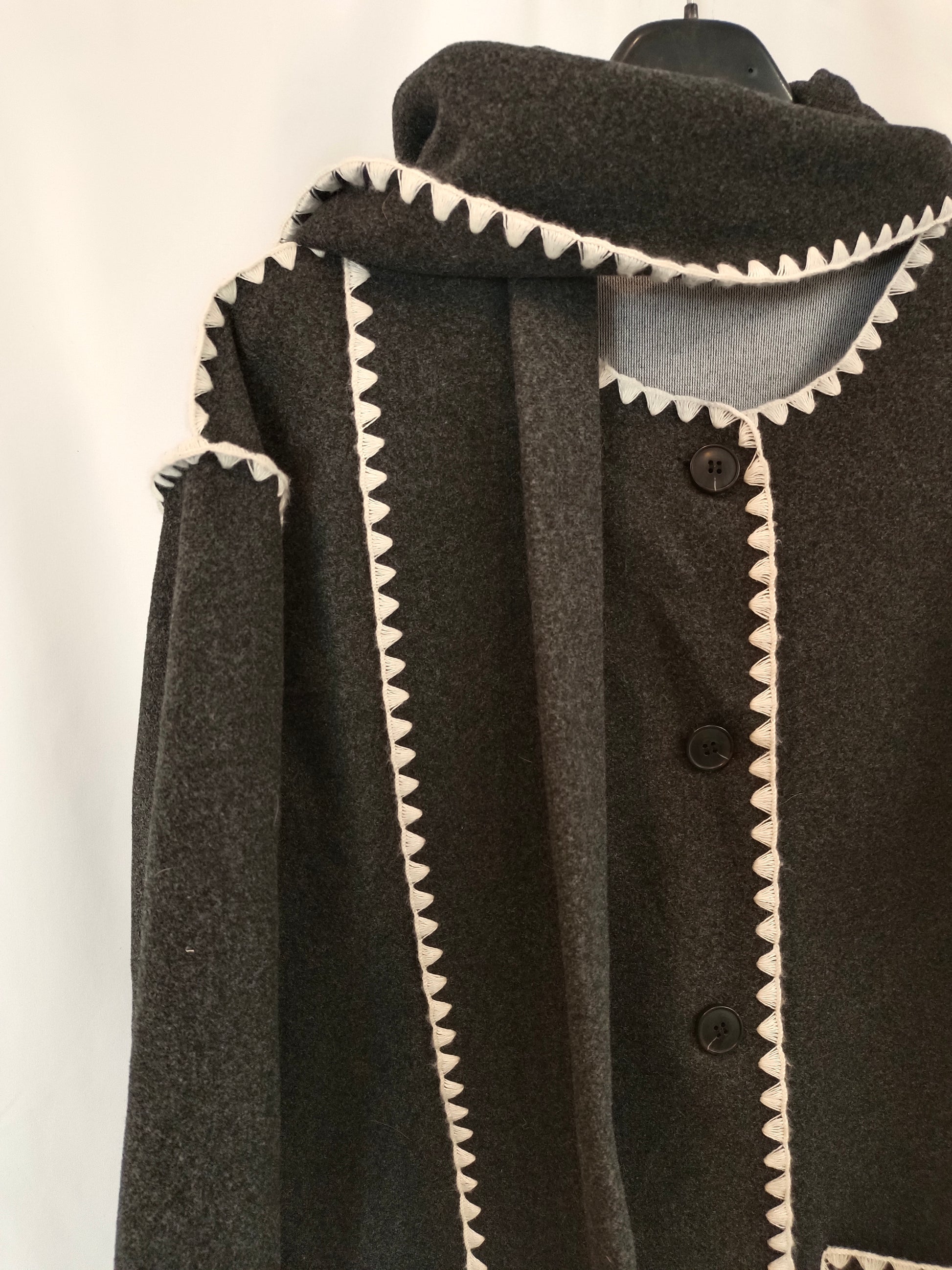 Abrigo de paño gris suave con detalle bordado y fajín