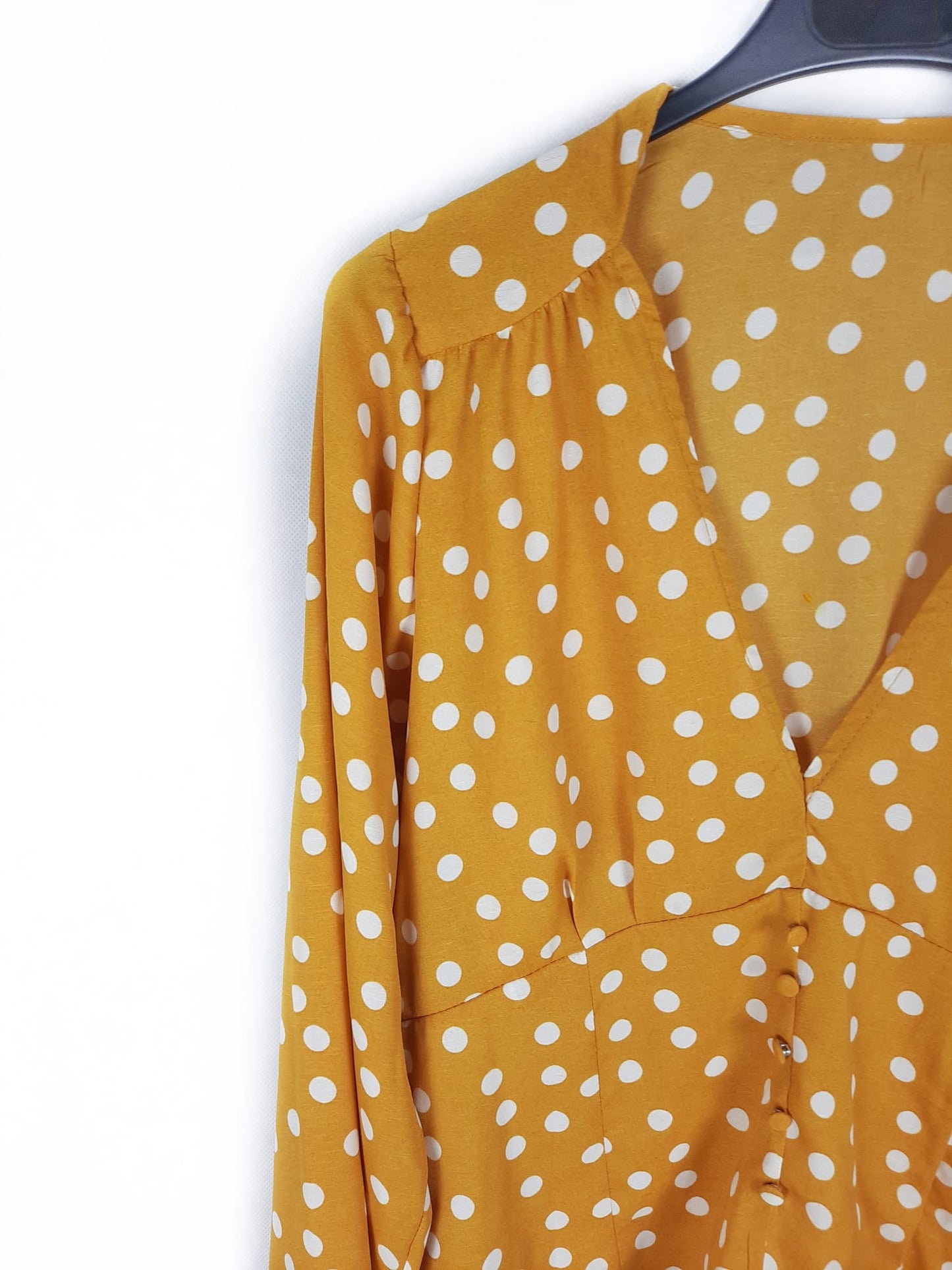 Otras. Blusa amarilla con lunares blancos. Escote en pico von pinzas. No elástica. De sisa a sisa 53 cm largo 55 cm