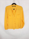 Camisa amarilla fluida semitransparente, abotonada y cuello mao. No es elástica. De sisa a sisa 55 cm largo 63 cm