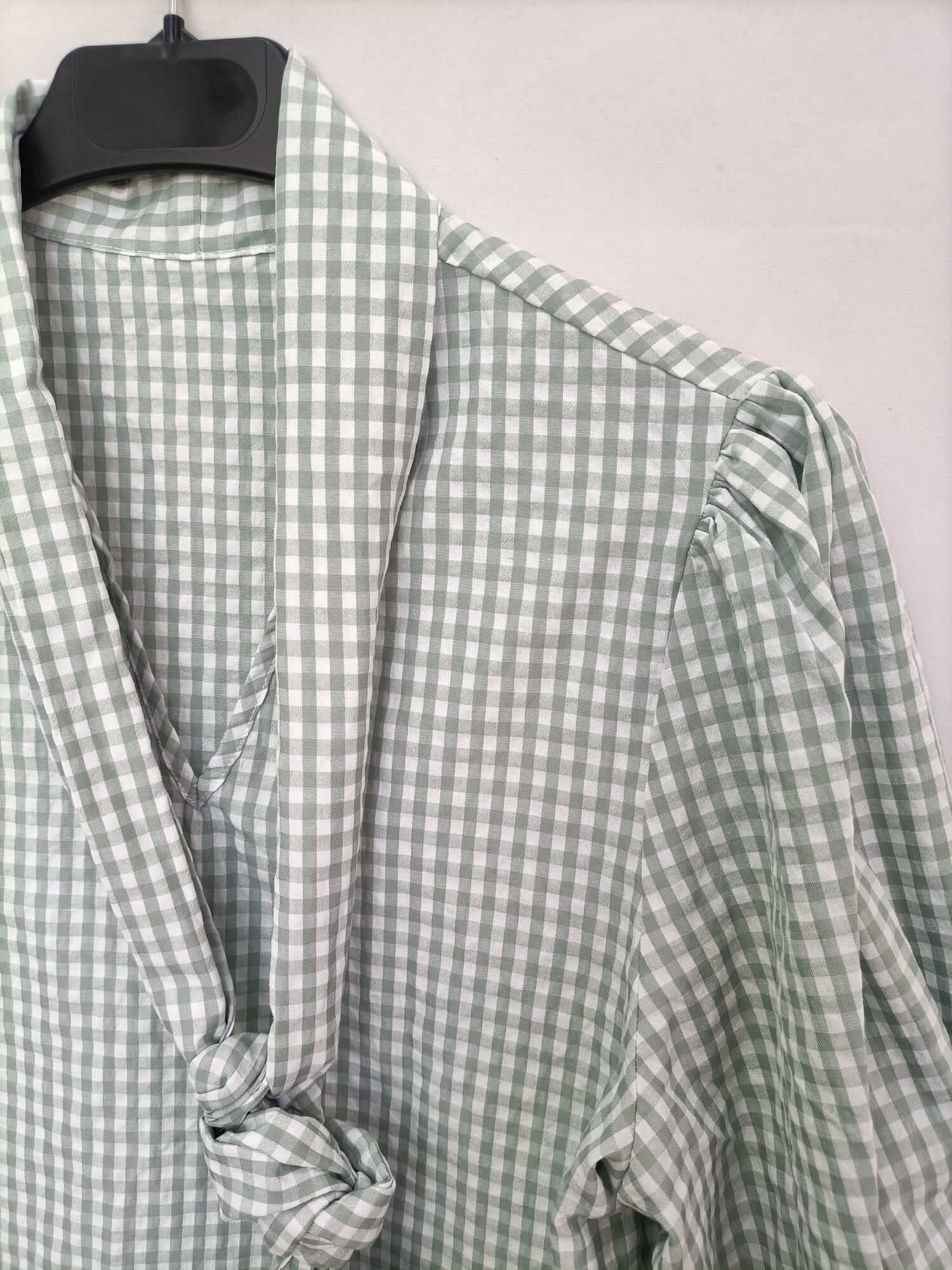 Otras. Tu (s/m). Blusa d cuadros vichi azul verdoso t blanco con lazada en el cuello y las mangas ligeramente abullonadas. De sisa a sisa 46 cm largo 65 cm