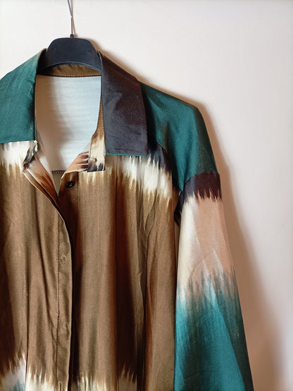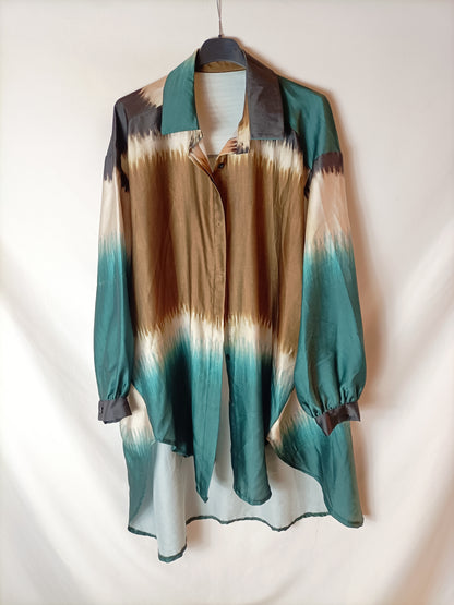 blusa oversized con estampado efecto tie dye tonos verdes y mangas abullonadas. Tara; enganchones en el tejido