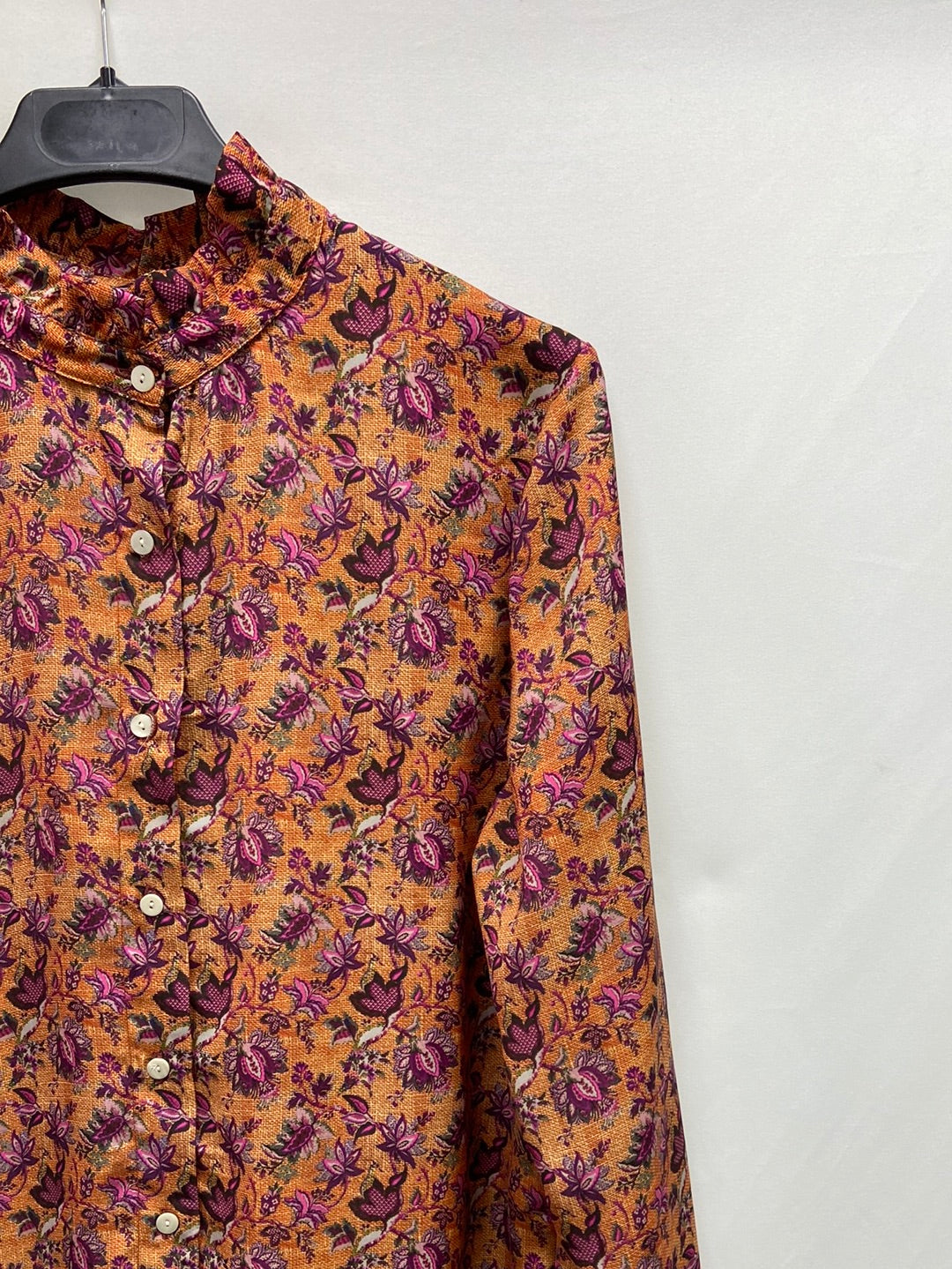 tejido tipo seda. Naranja con flores. Cuello Perkins fruncido. De sisa a sisa 50 cm largo 68 Cm
