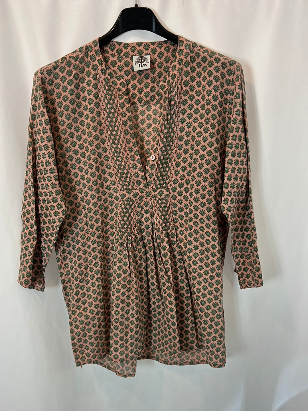 Blusa rosa con hojas verdes . Espalda 50cm, largo 70cm