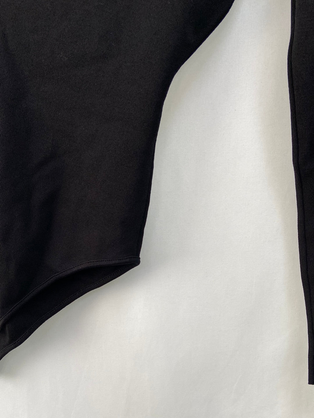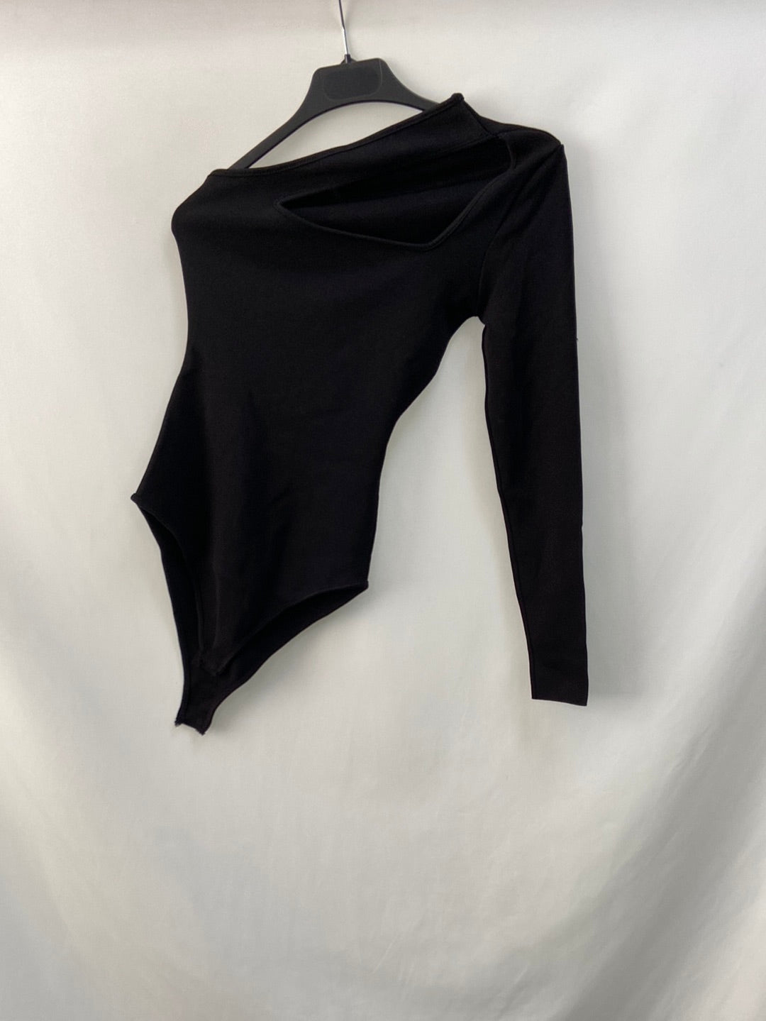 body negro punto canalé muy elástico. Asimétrico manga larga con abertura. Largo 78 cm