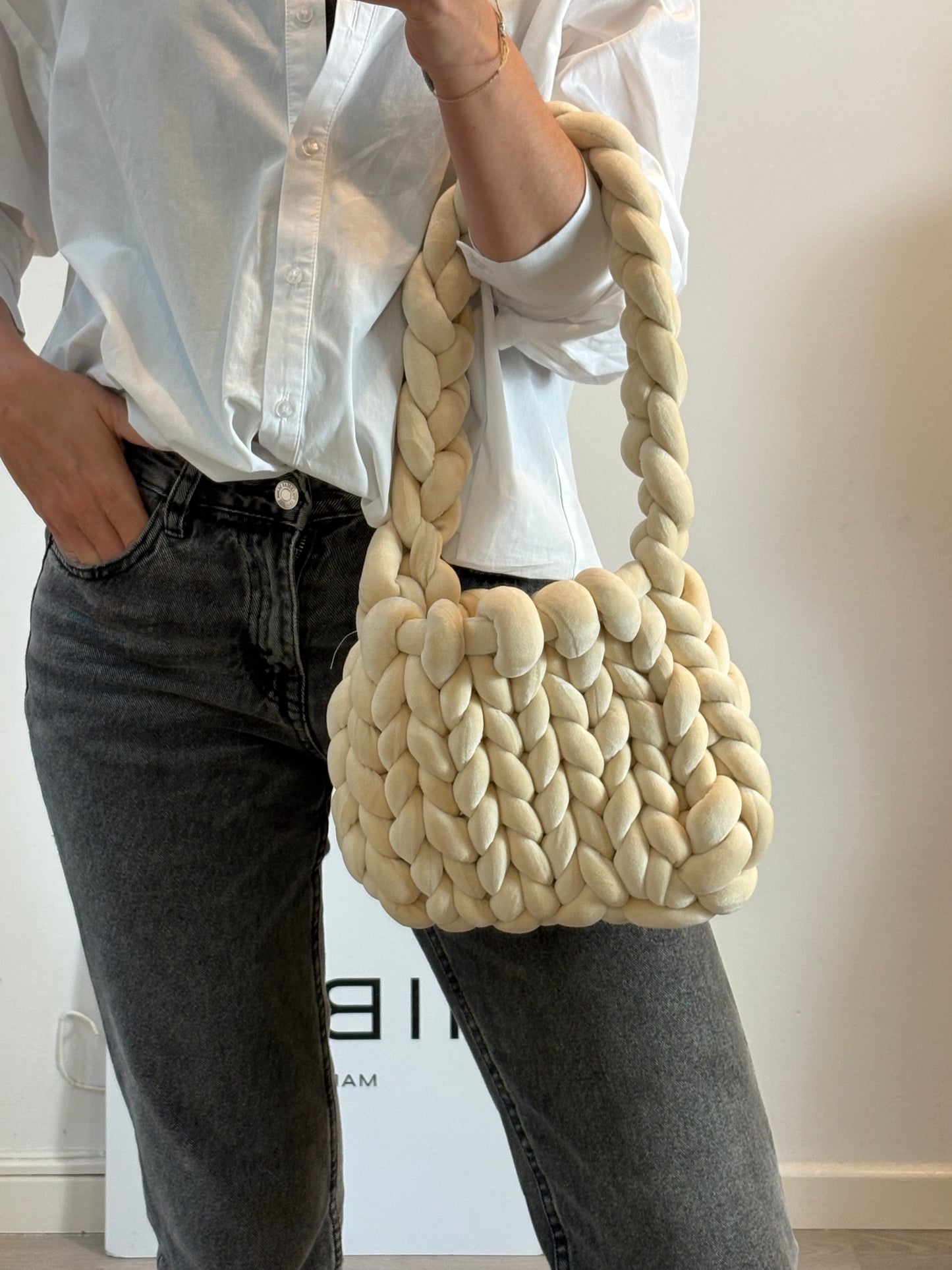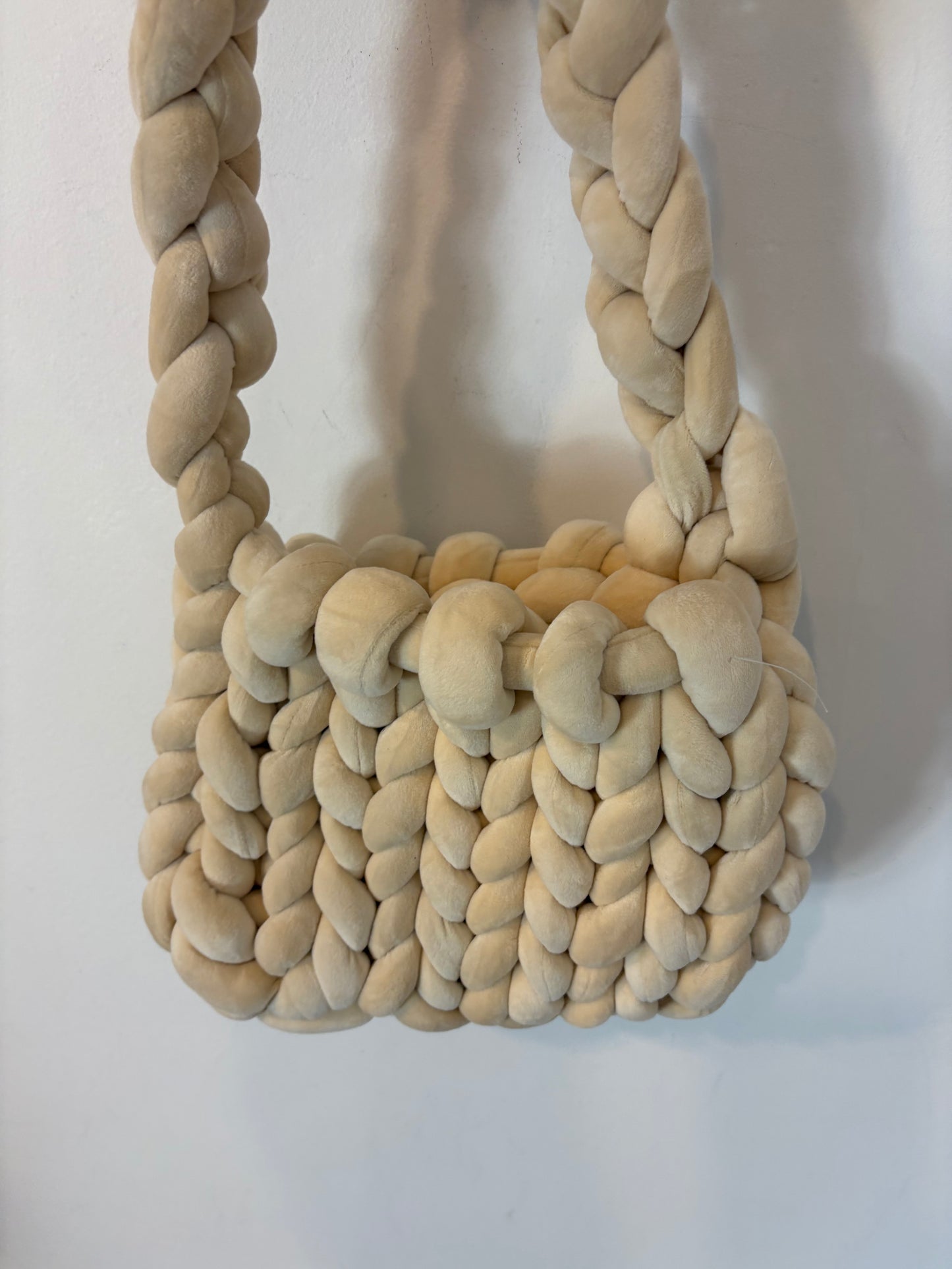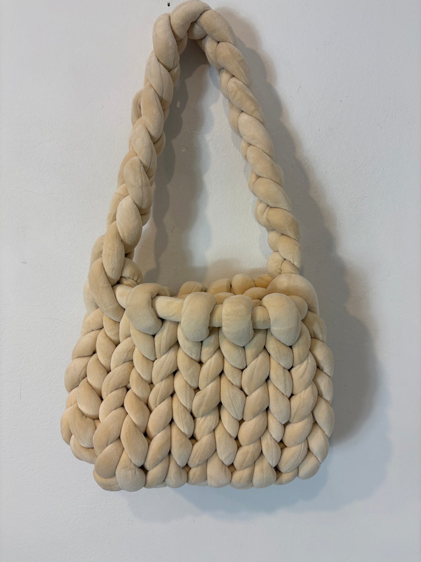 Bolso ganchillo grueso beige claro. Alto 22 cm