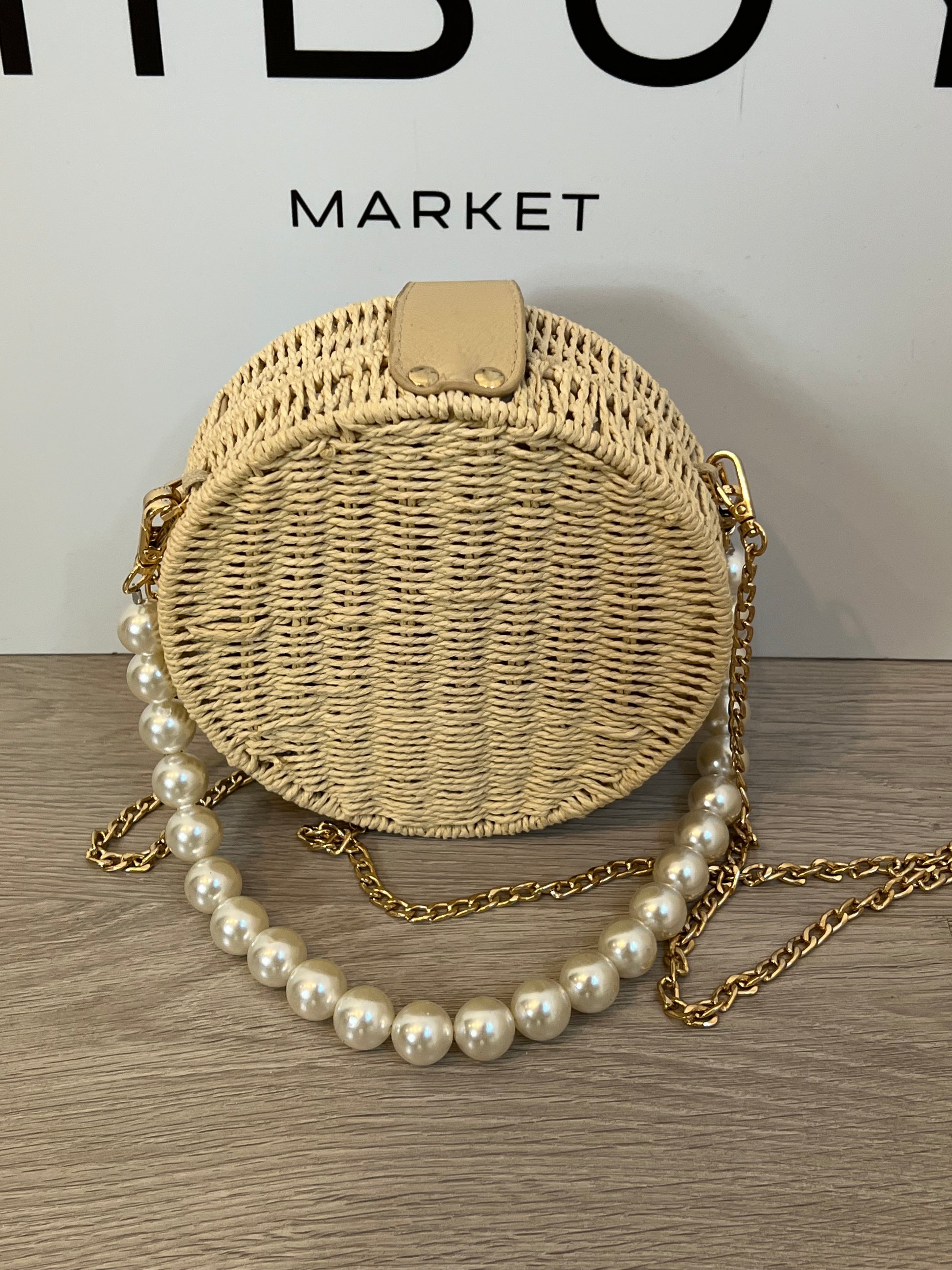 bolo de rafia con detalle de caracolas. Asa de cadena y perlas