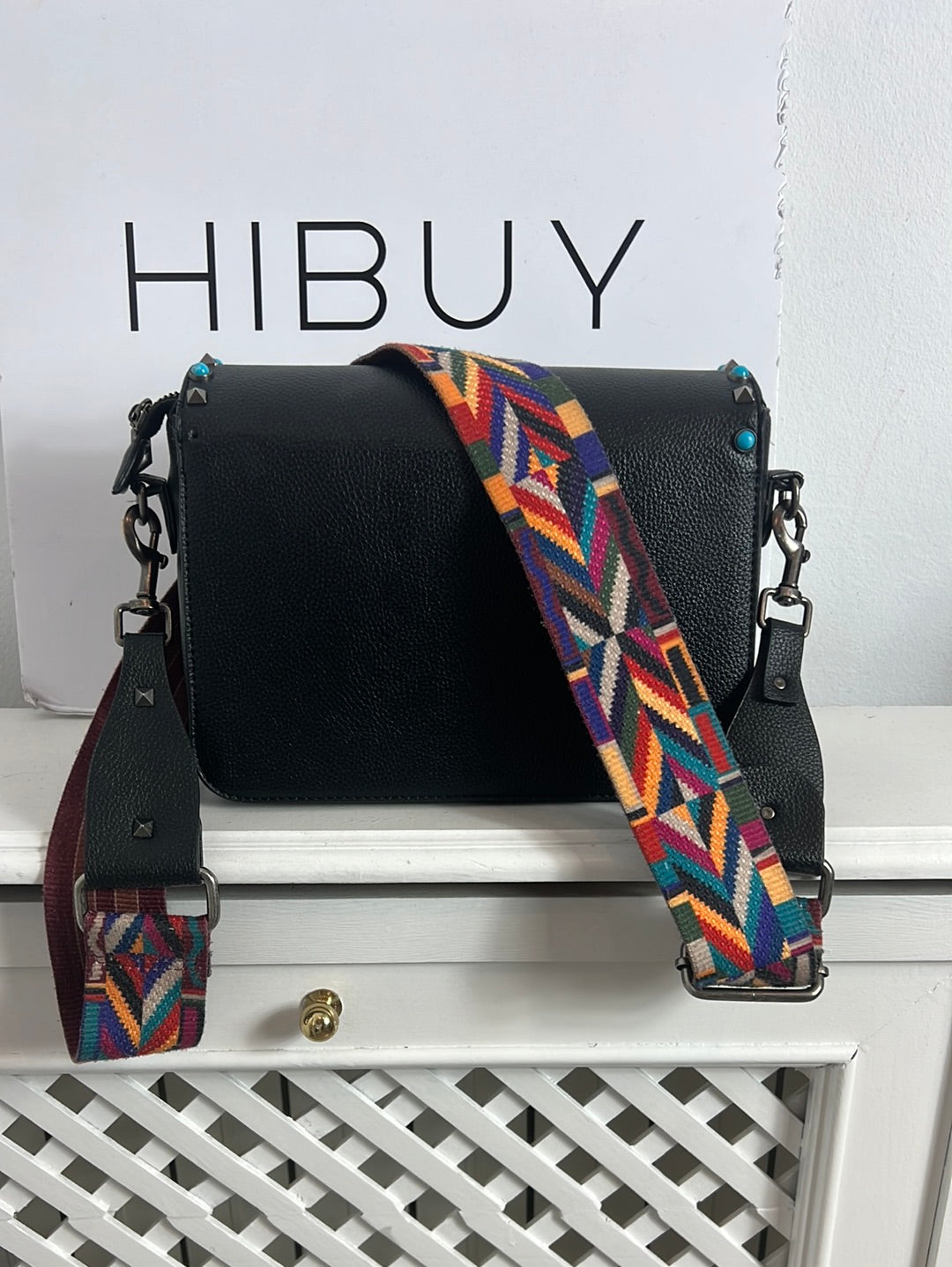 Bolso tachuelas y asa étnica. Tara: le falta una tachuela pero en la parte no visible. Rígido.