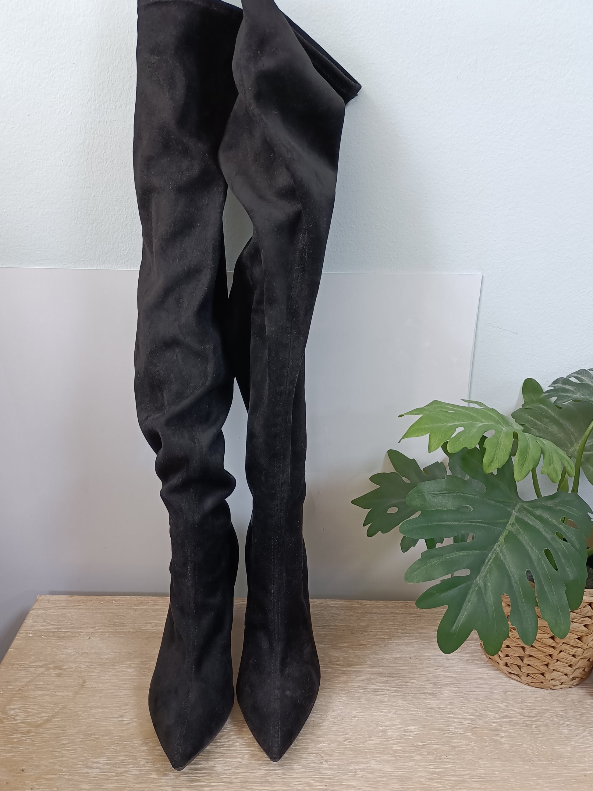 Otras.37. botas altas negras de antelina con tacón. Cañs ajustada y blanca. Caña 62 cm largo 8 cm
