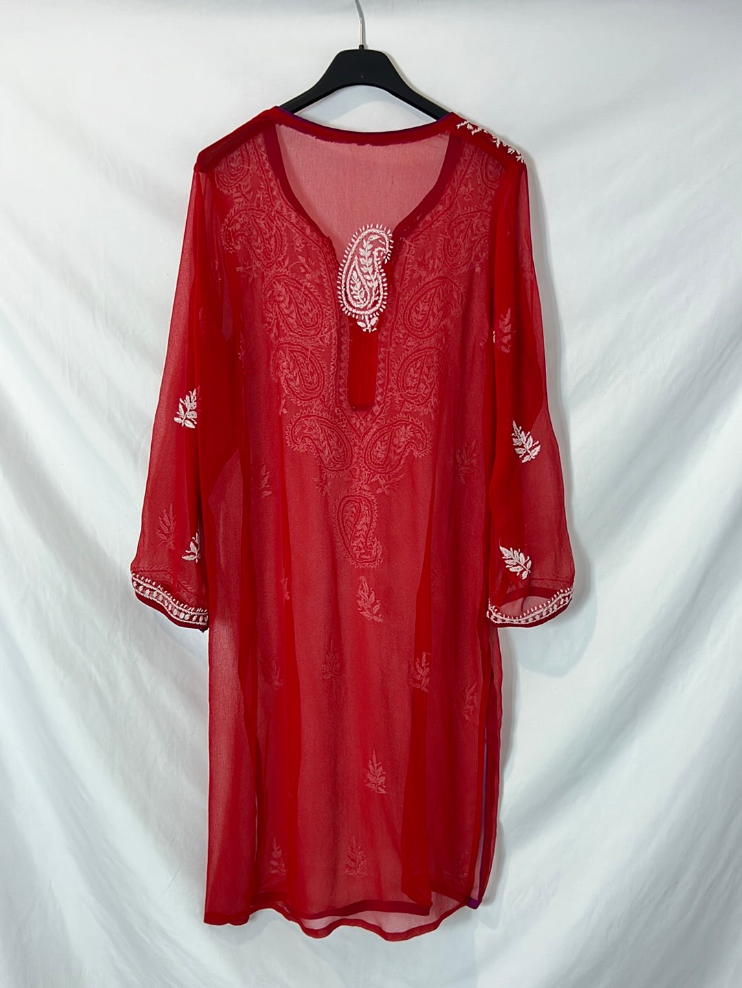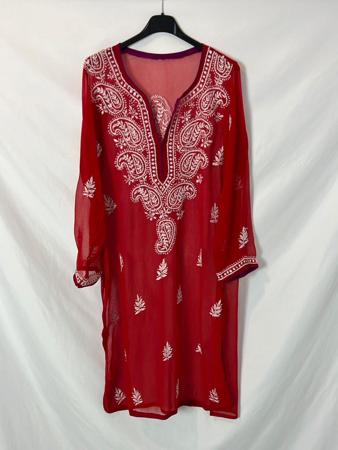 vestido/kaftan rojo bordado con aperturas laterales . Largo b102cm, hombros 39cm