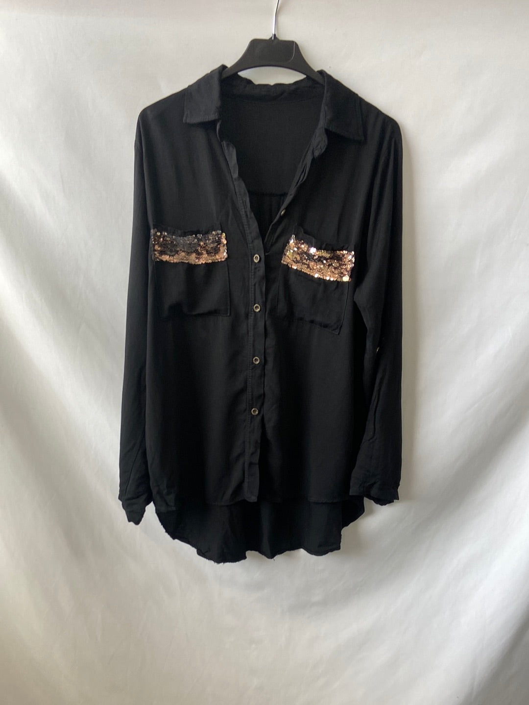 Sin datos. Camisa negra fluida estilo oversized con bolsillos en la solapa con detalle de lentejuelas en cobre. No es elástica. De sisa a sisa 56 cm largo 78 cm