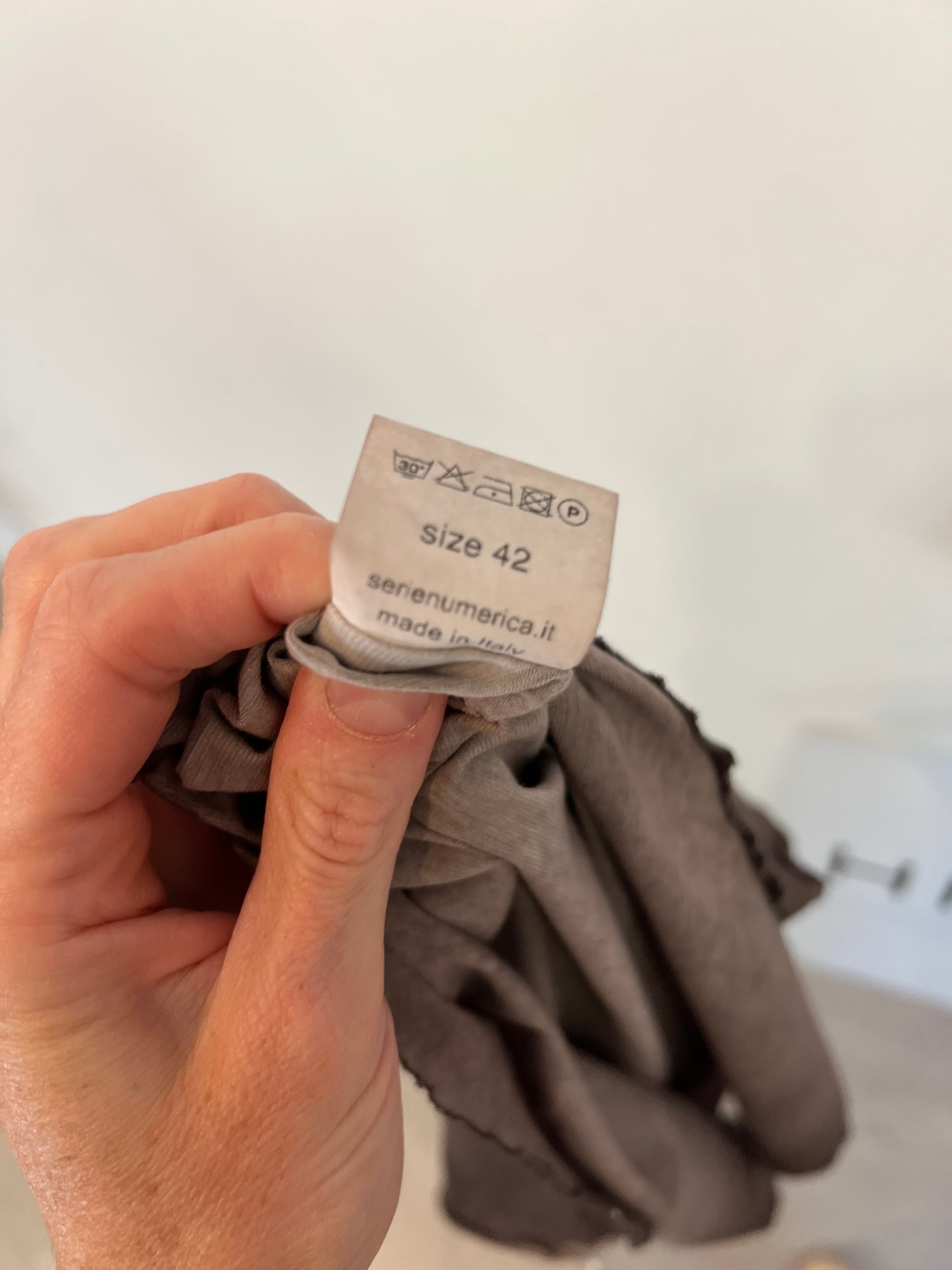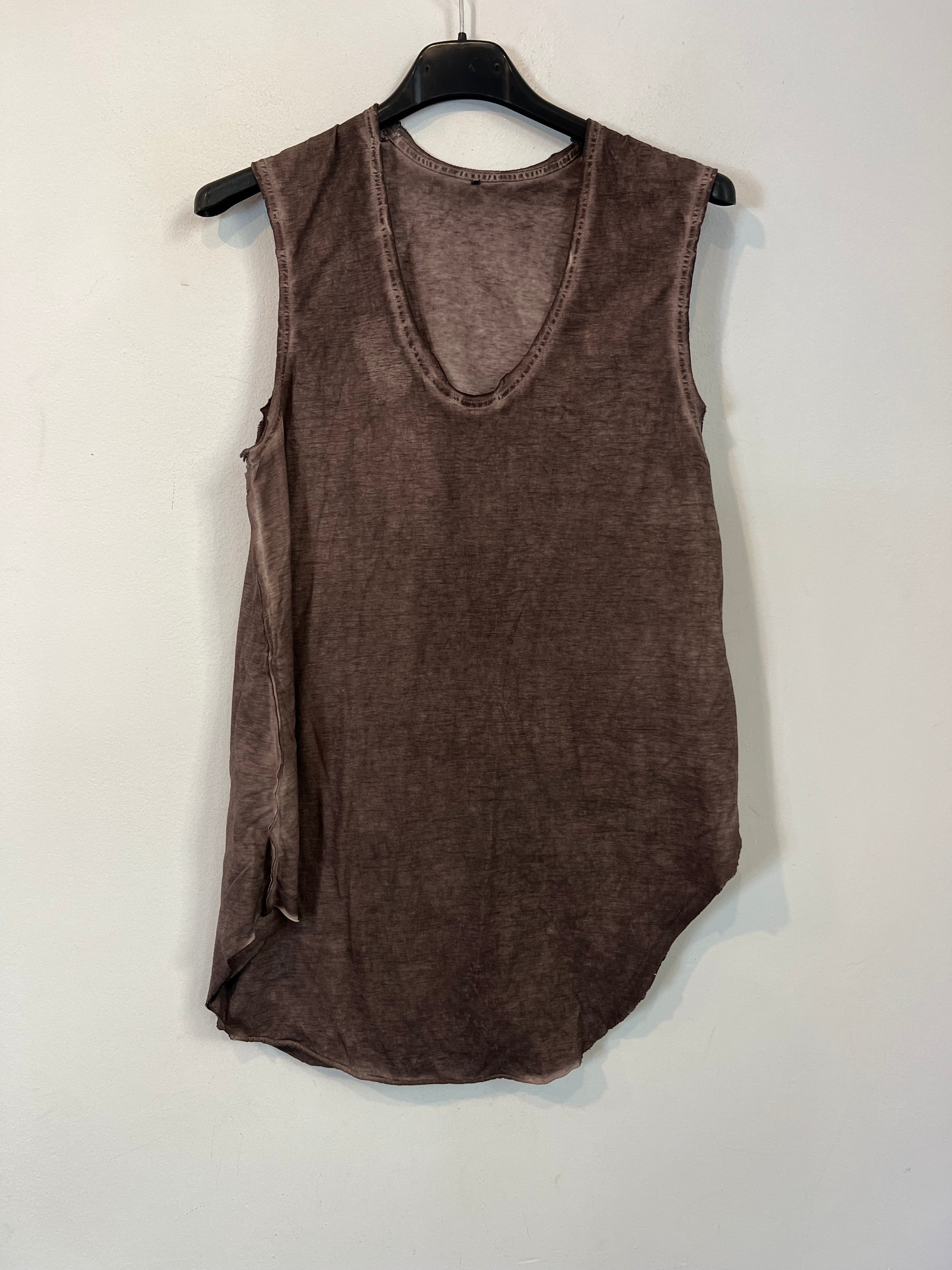 elástica. 95% algodón. de sisa a sisa 45cm largo 70 cm. Talla 42 en etiqueta
