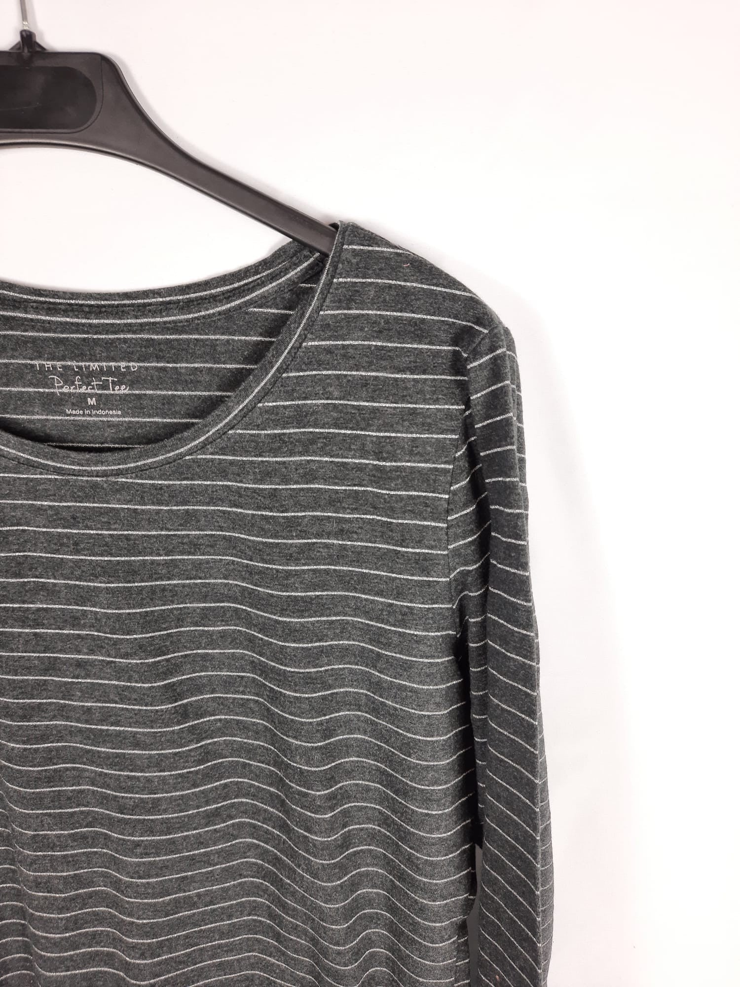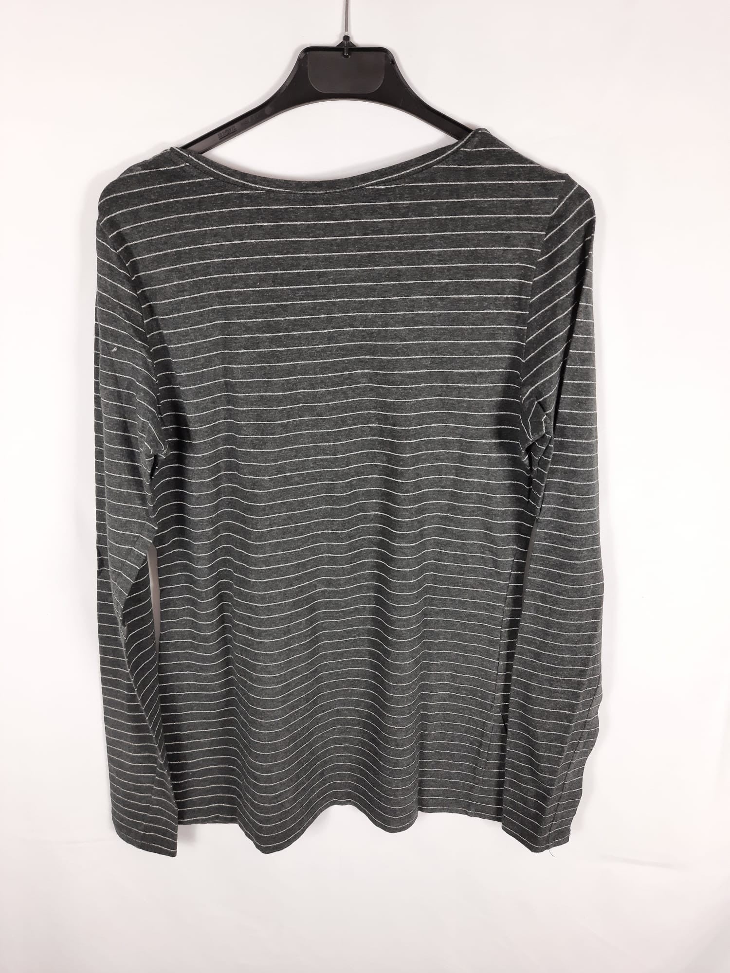 Camiseta gris con rayas plateadas. Elástica. Largo 66 cm