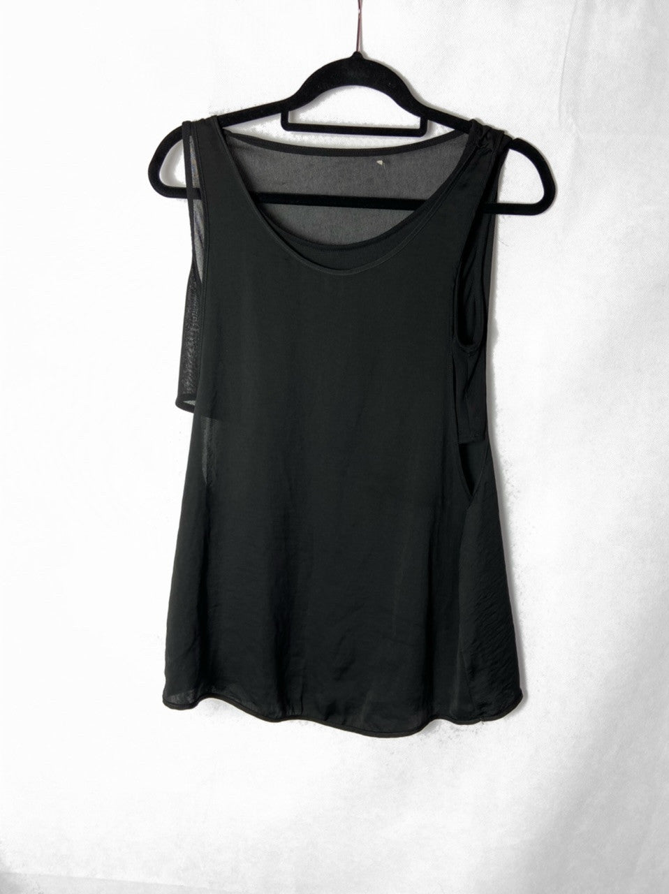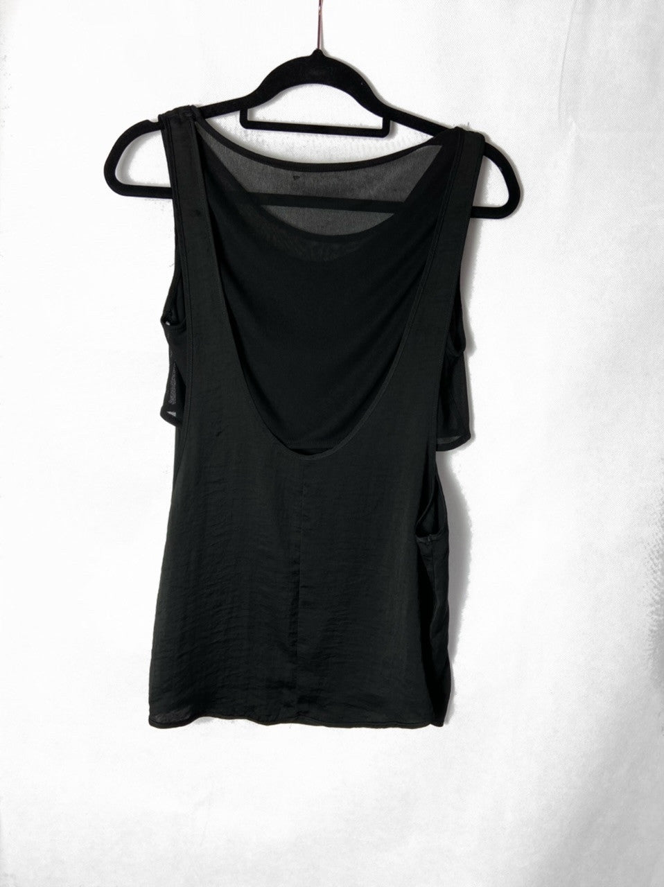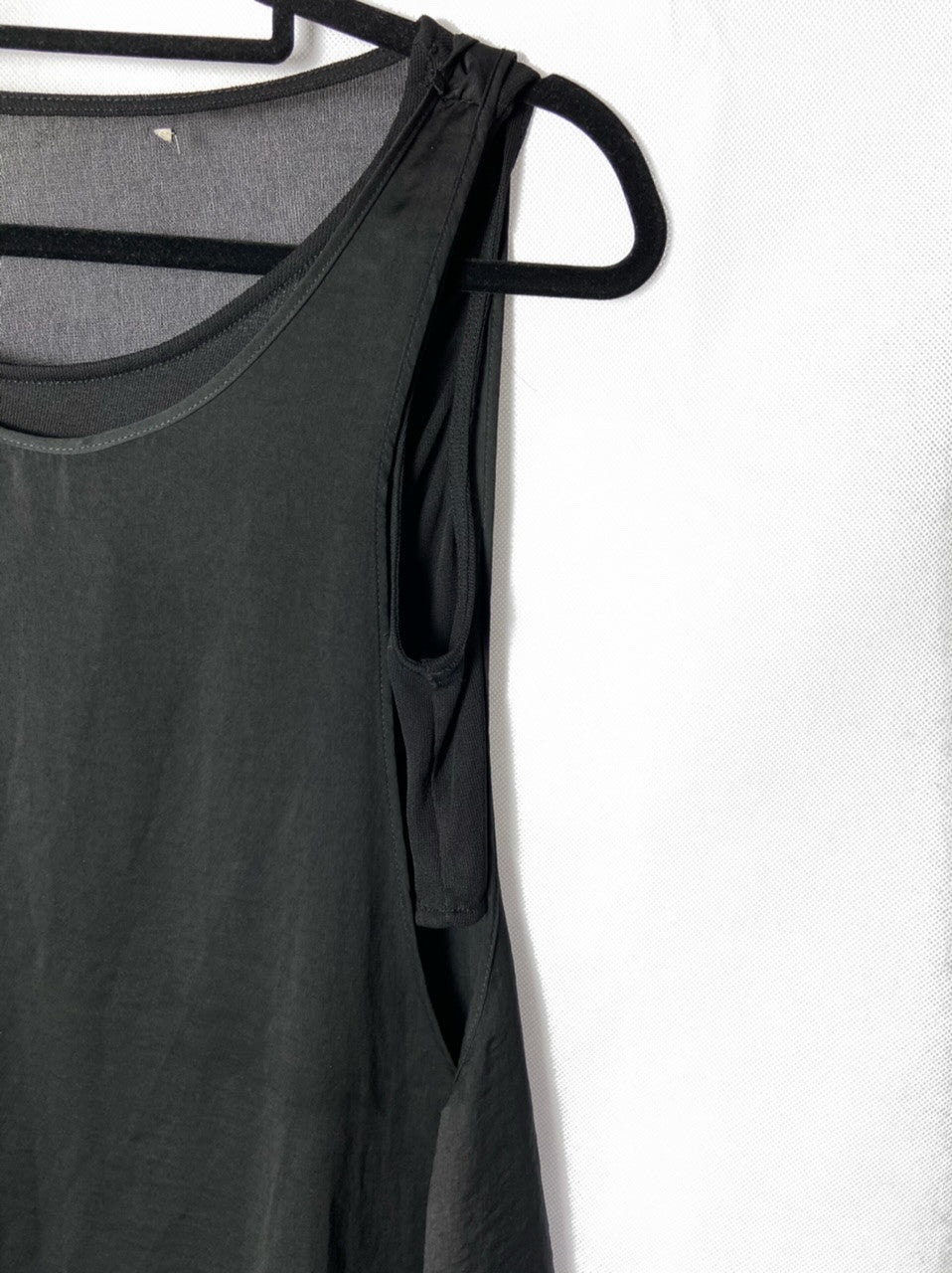 Camiseta negra fluida y de sisas amplia, tiene top incorporado. Es elástica y tiene doble capa