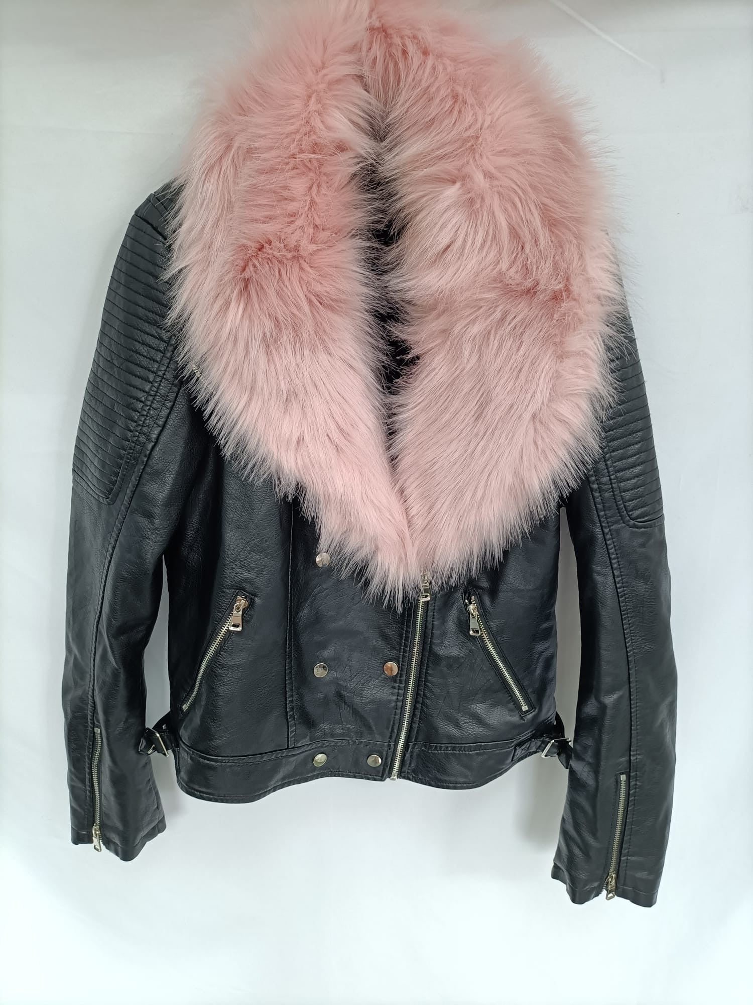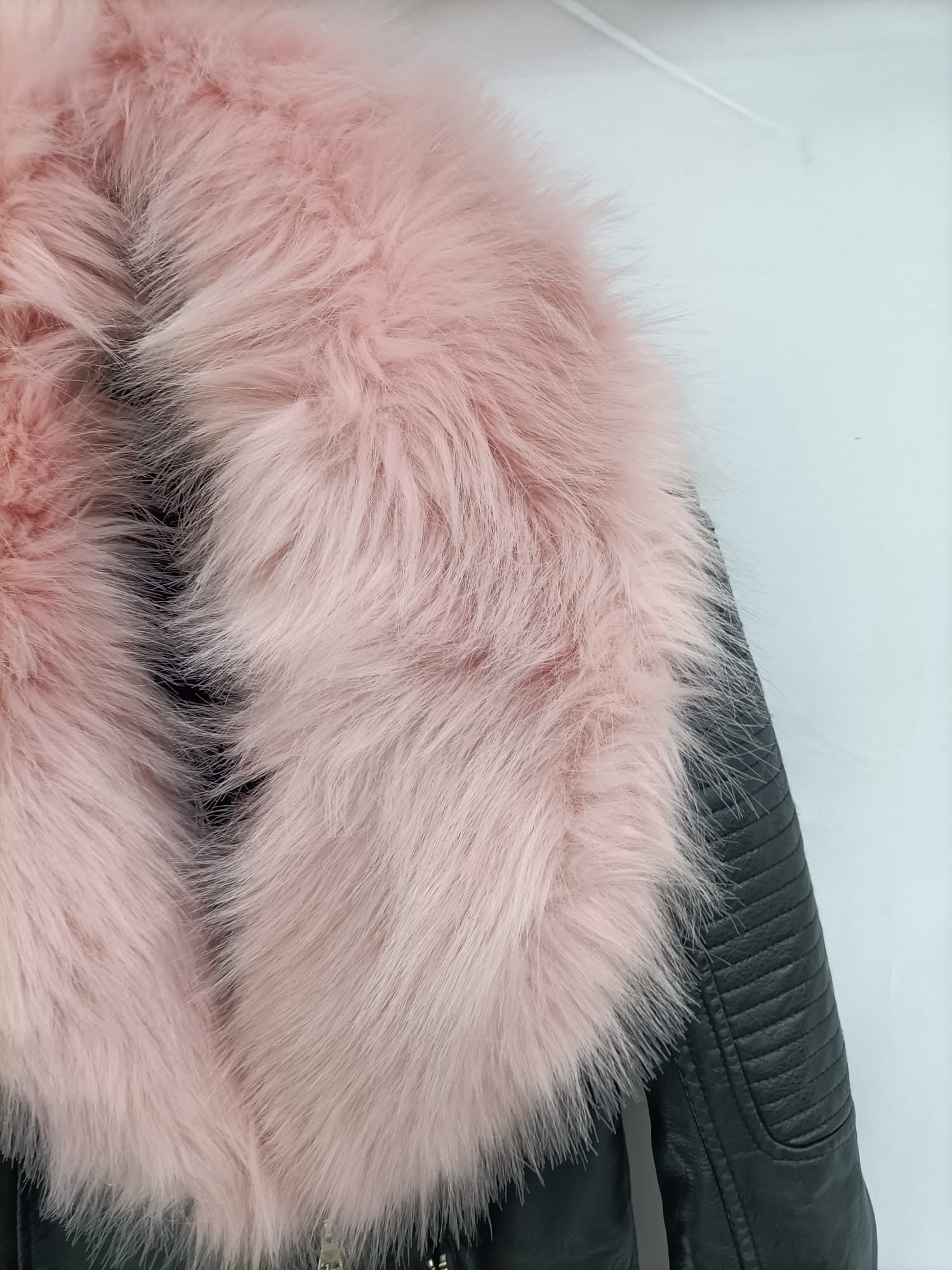 Cazadora negra de polipiel con interior de pelito y cuello de pelo rosa extraíble. No elástica. De sisa a sisa 48 cm largo 68 cm