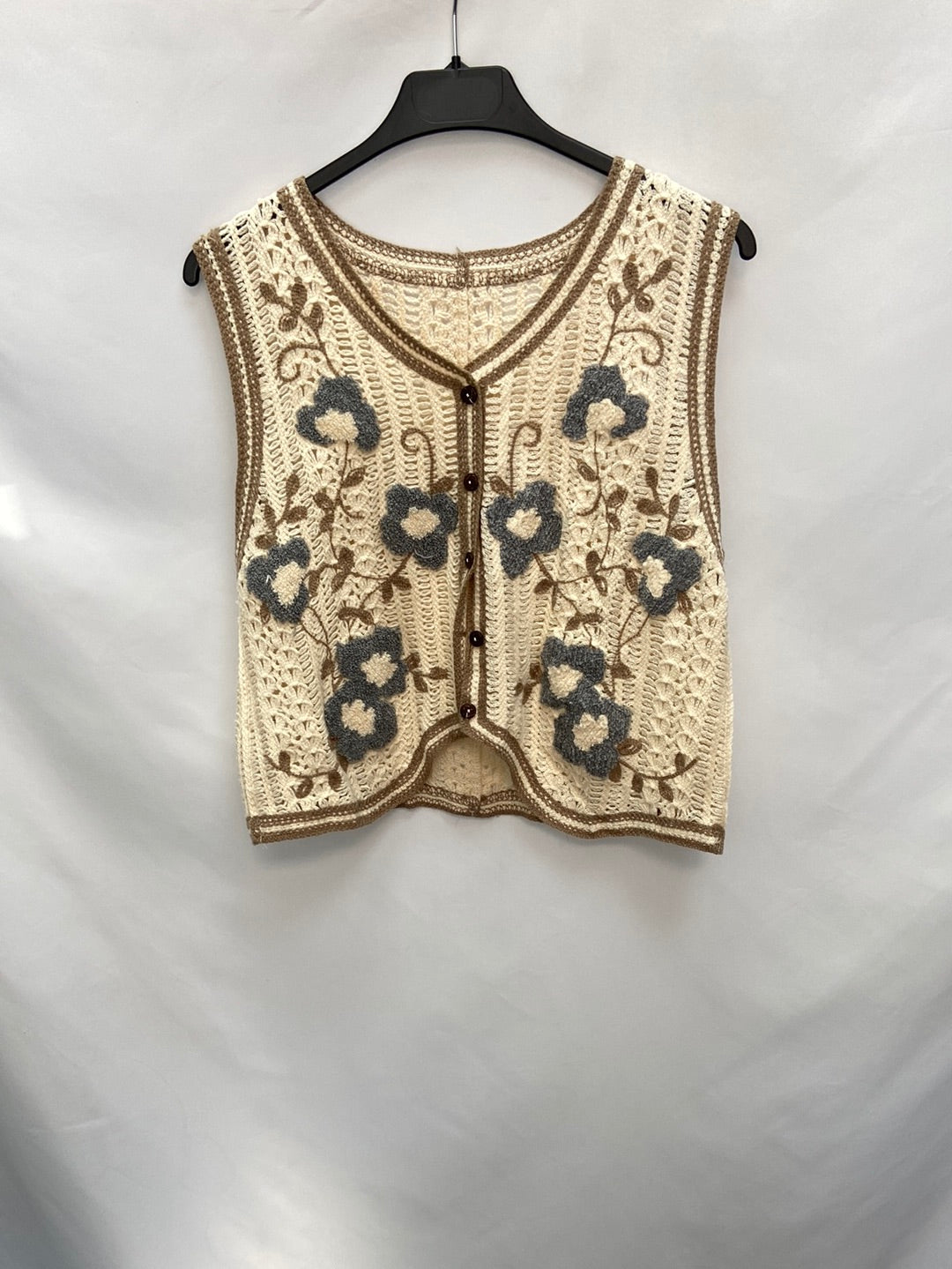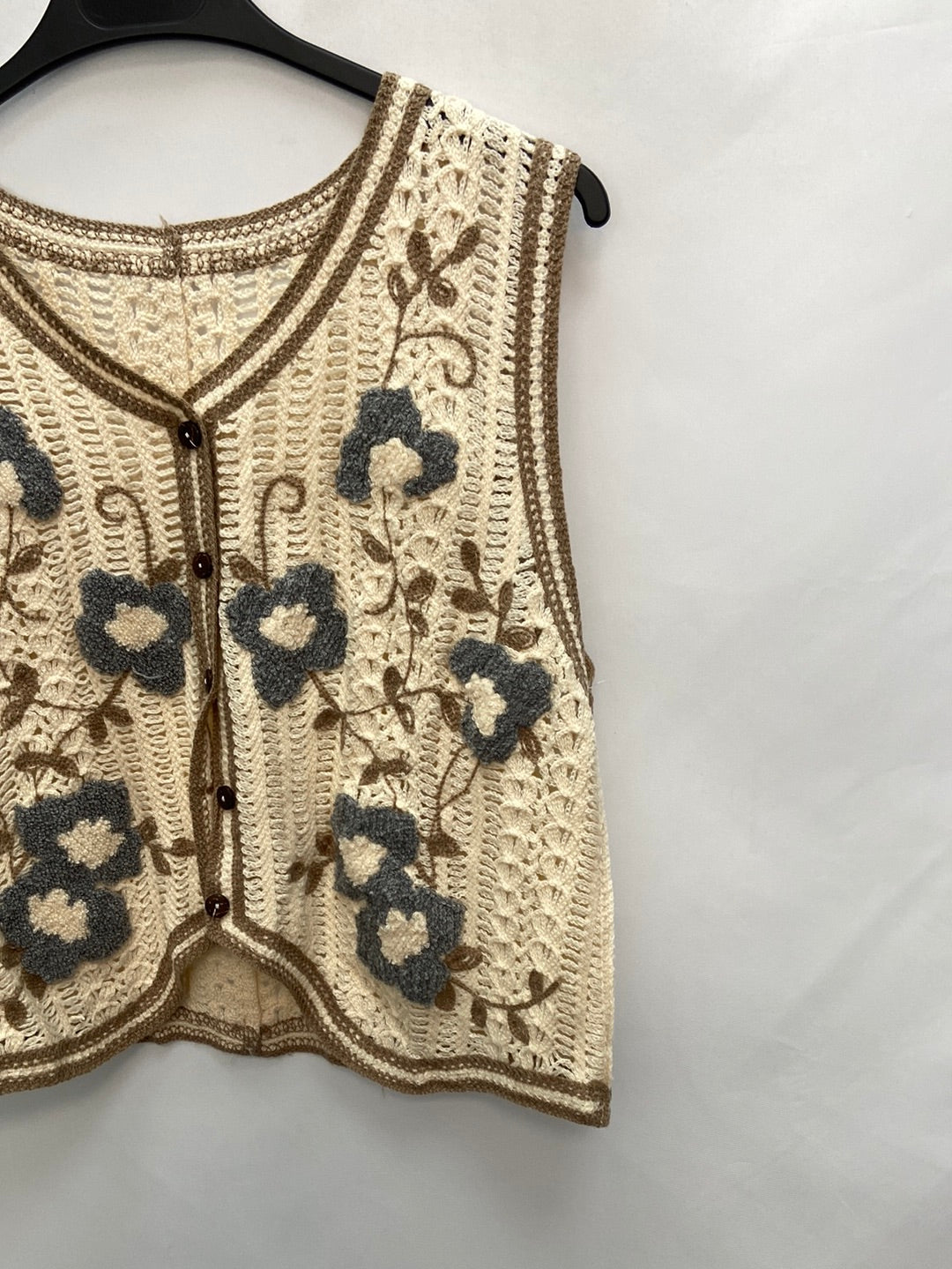 Top/chaleco beige de croche con fflores bordadas. Elástico y abotonado. largo 49 cm