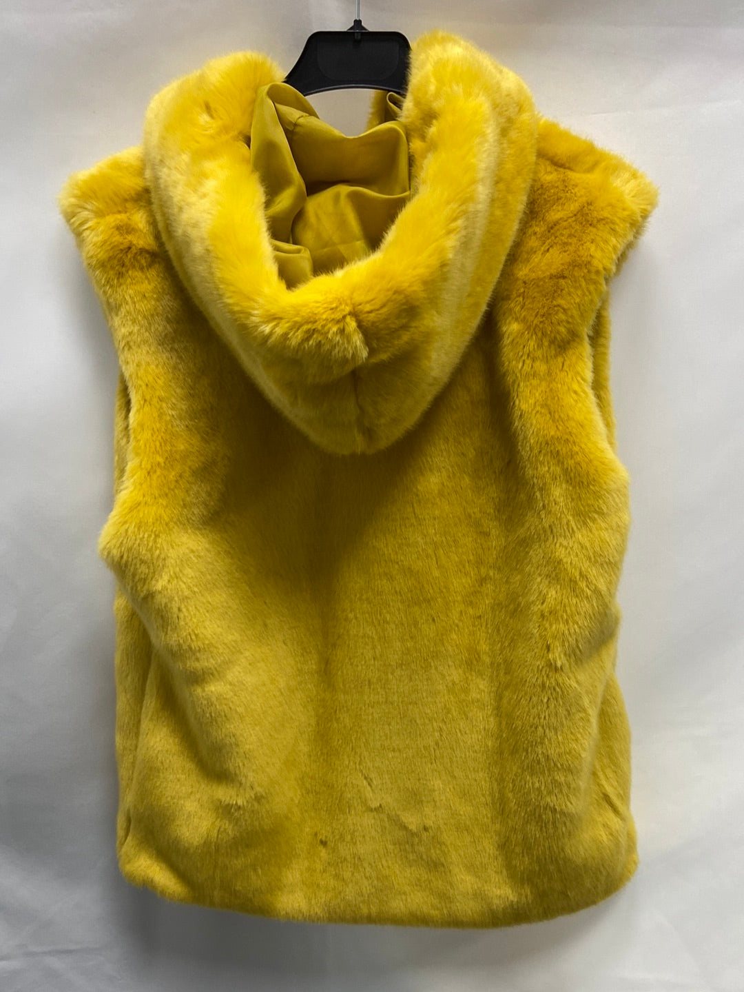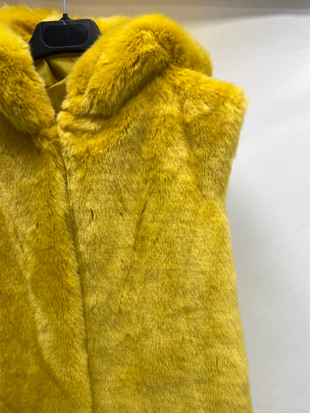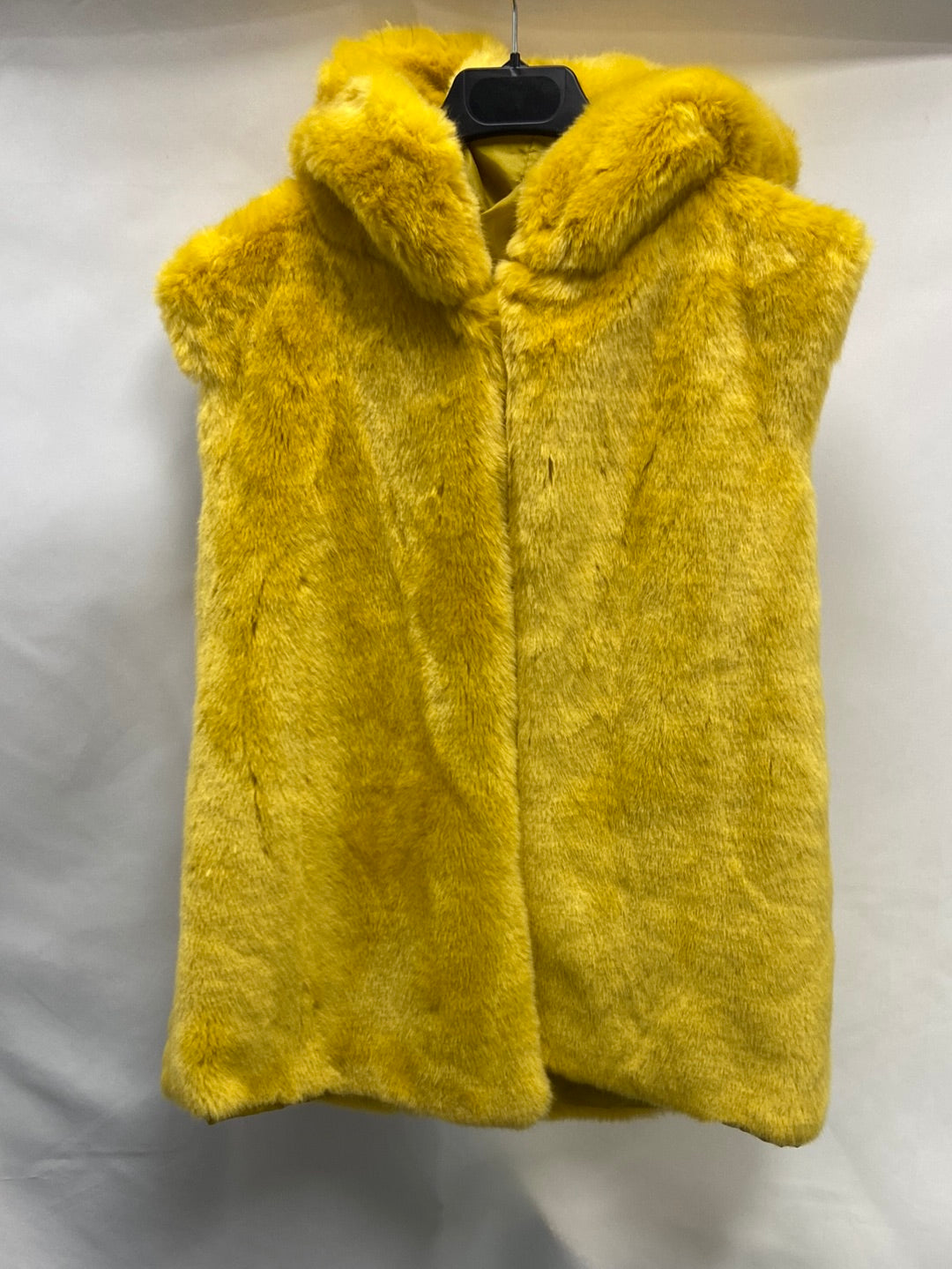 Chaleco mostaza de pelo con capucha. Tiene un enganche en la zona del cuello para abrochar. Bolsillos laterales. De sisa a sisa 52 cm, largo 65 cm