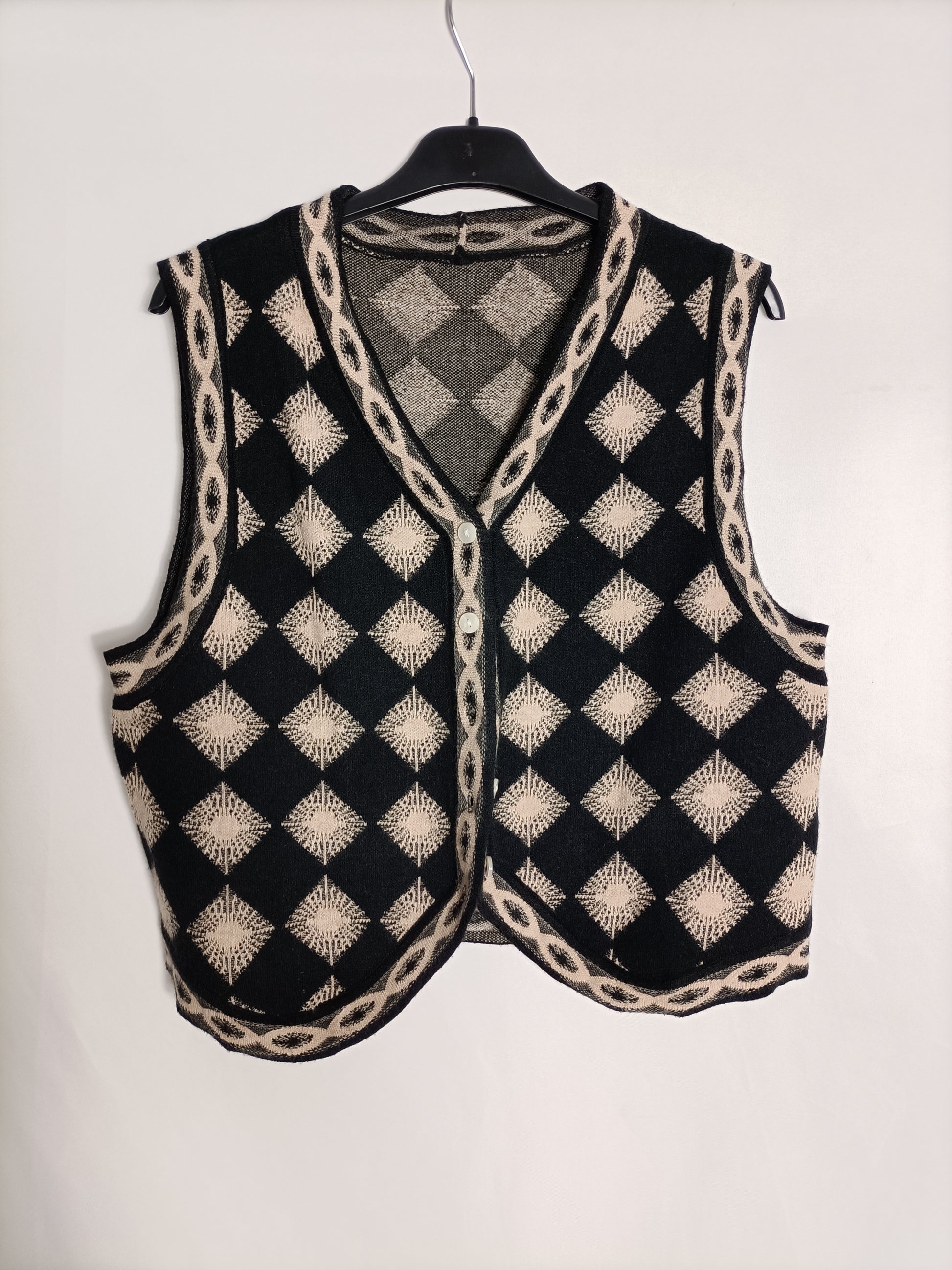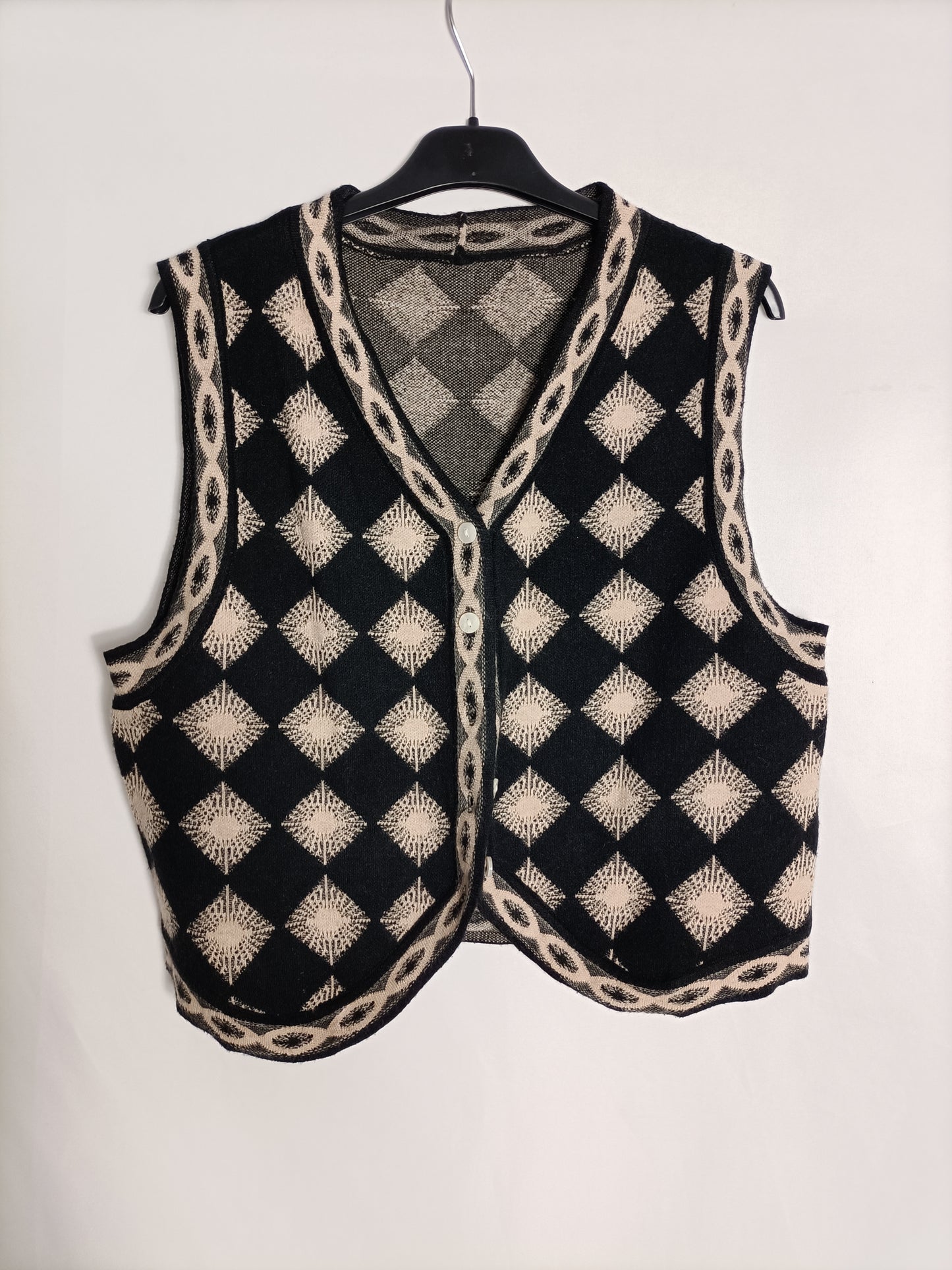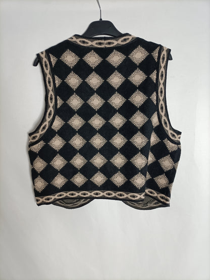 chaleco negro con detalle en beige. elástico. largo 46 cm