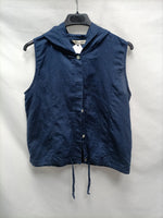 Chaleco sin mangas azul, el tejido es tipo lino, tiene capucha y se abrocha con botones