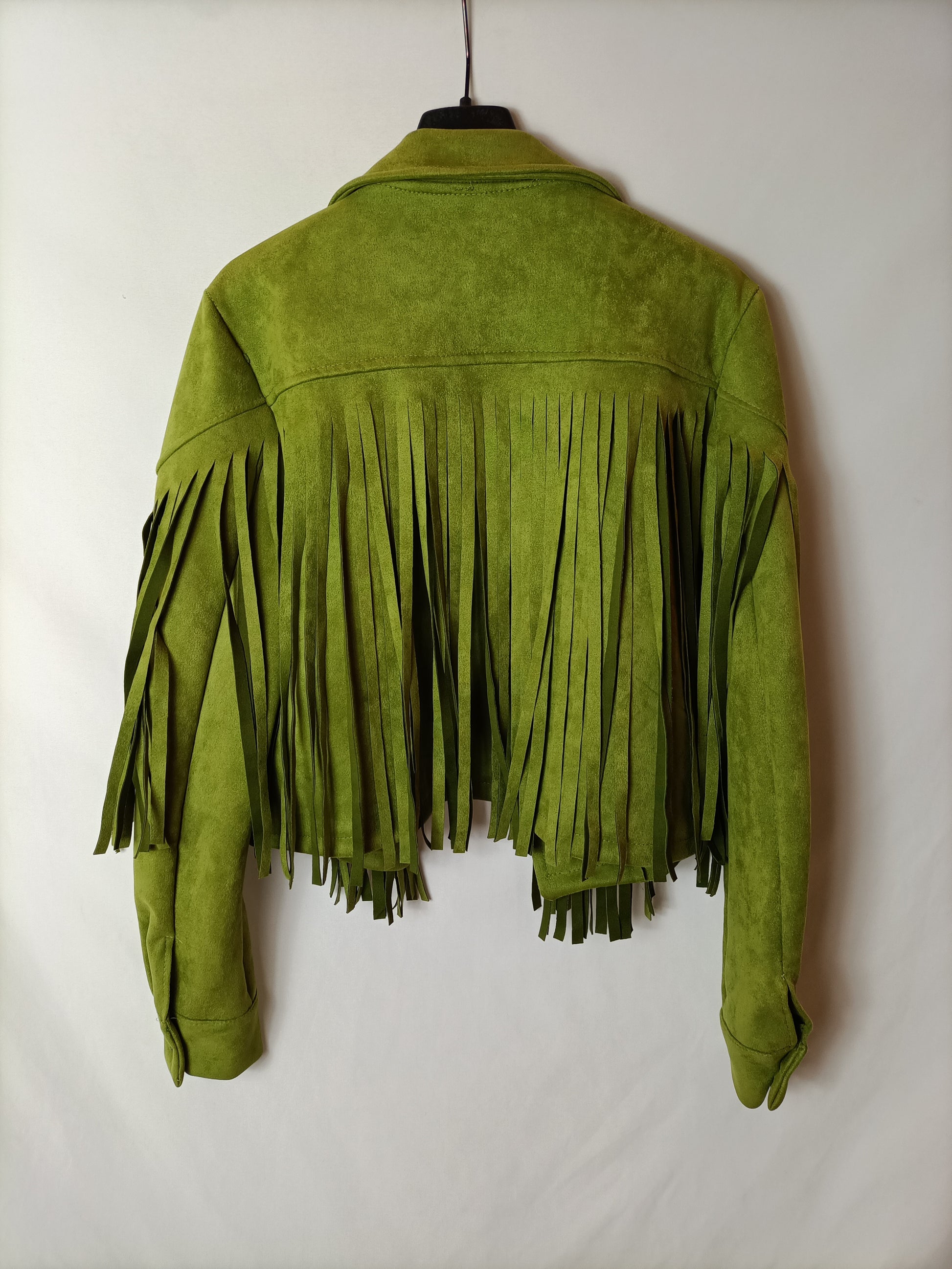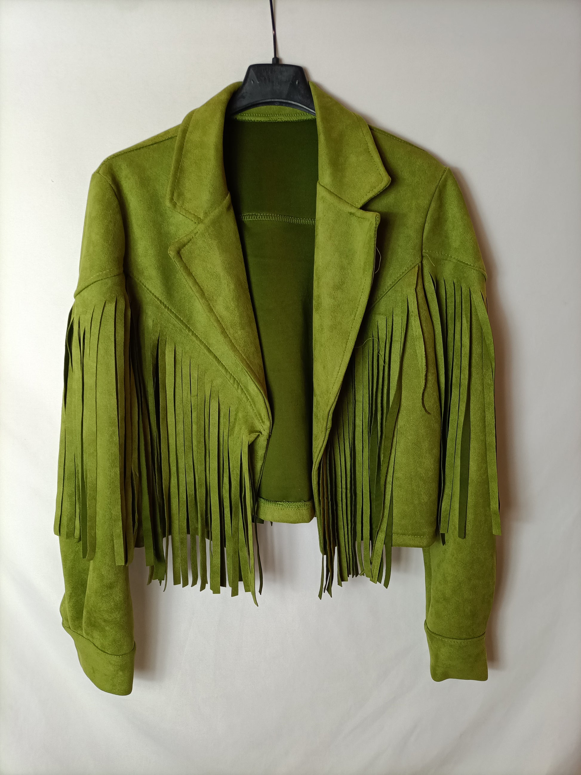 chaqueta verde lima de antelina con flecos. No se abrocha. largo 46 cm