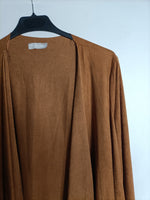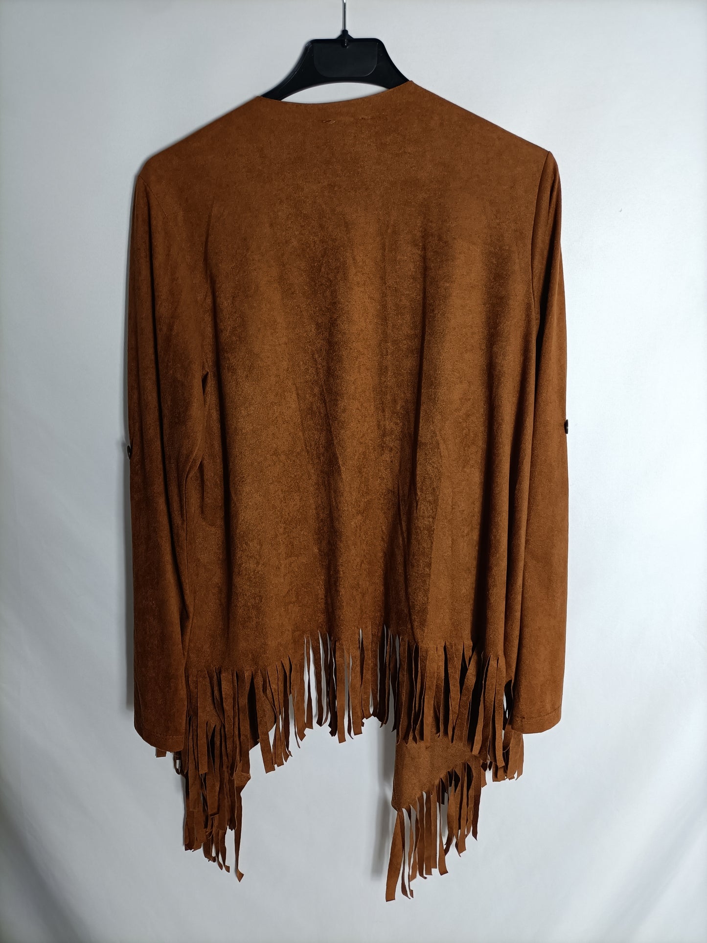 chaqueta de antelina camel fina con flecos. Elástica. No se abrocha