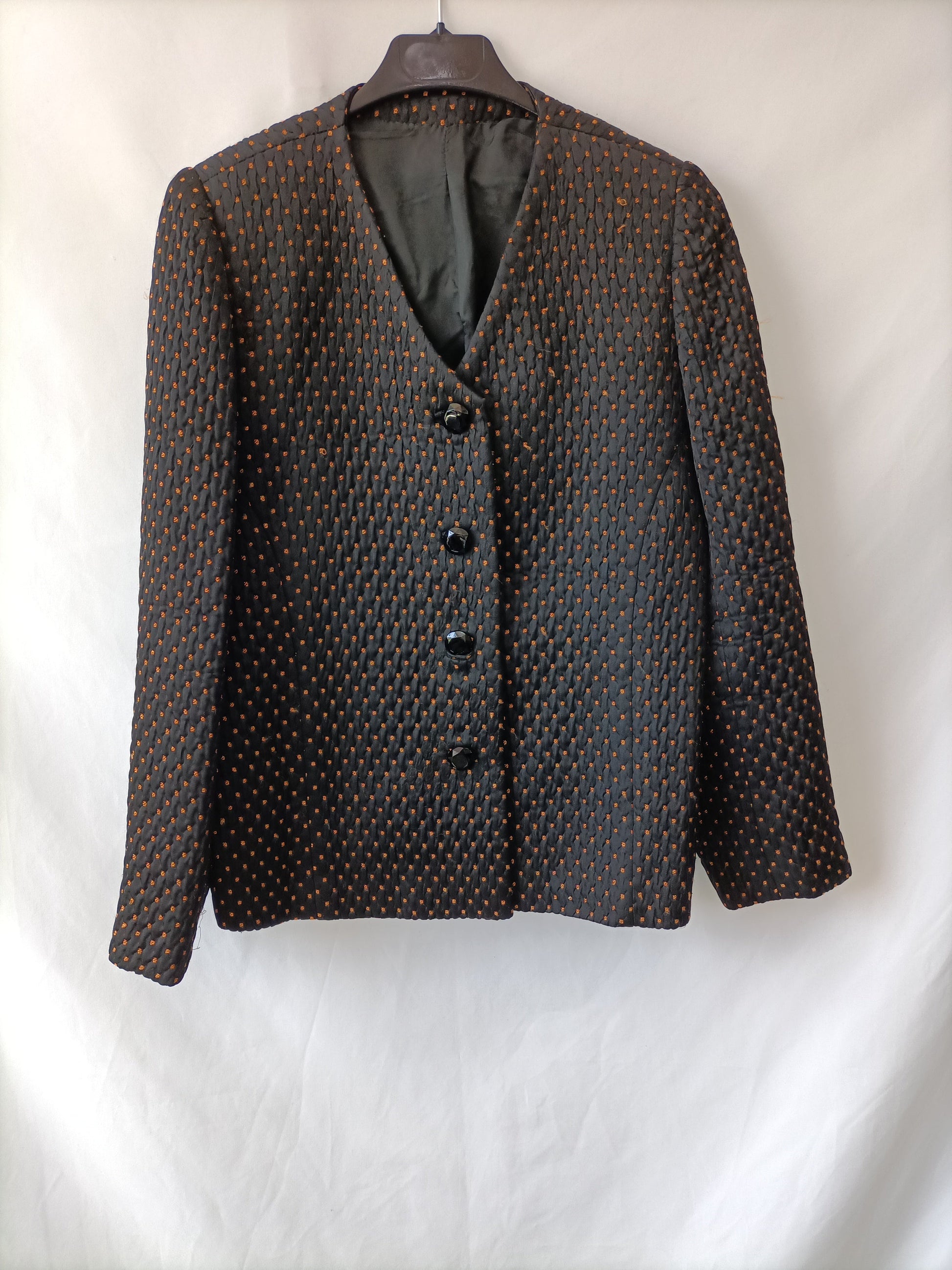 Chaqueta negra con plumeti bordado en dorados. Abotonada. No elástica. De sisa a sisa 48 cm largo 60 cm