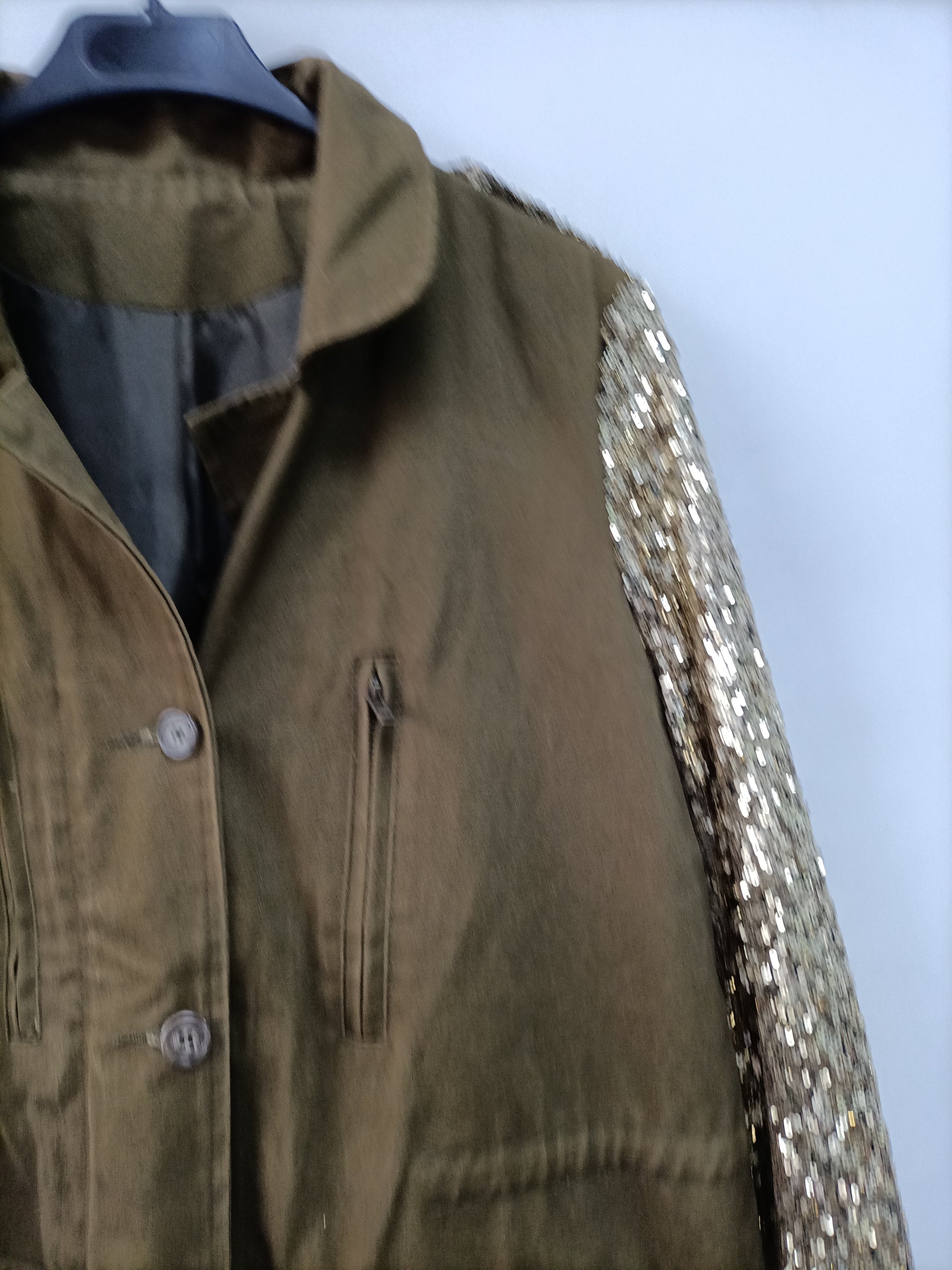 chaqueta verde con las manas de lentejuelas doradas. se abrocha con cremallera y botones. de sisa a sisa 48 cm largo 76 cm. Tara: mini manchas desteñido, no se nota mucho