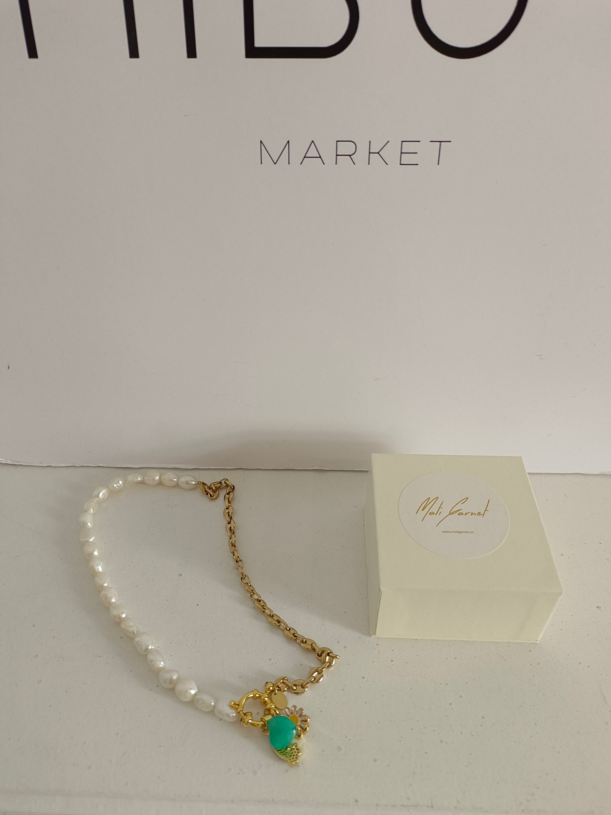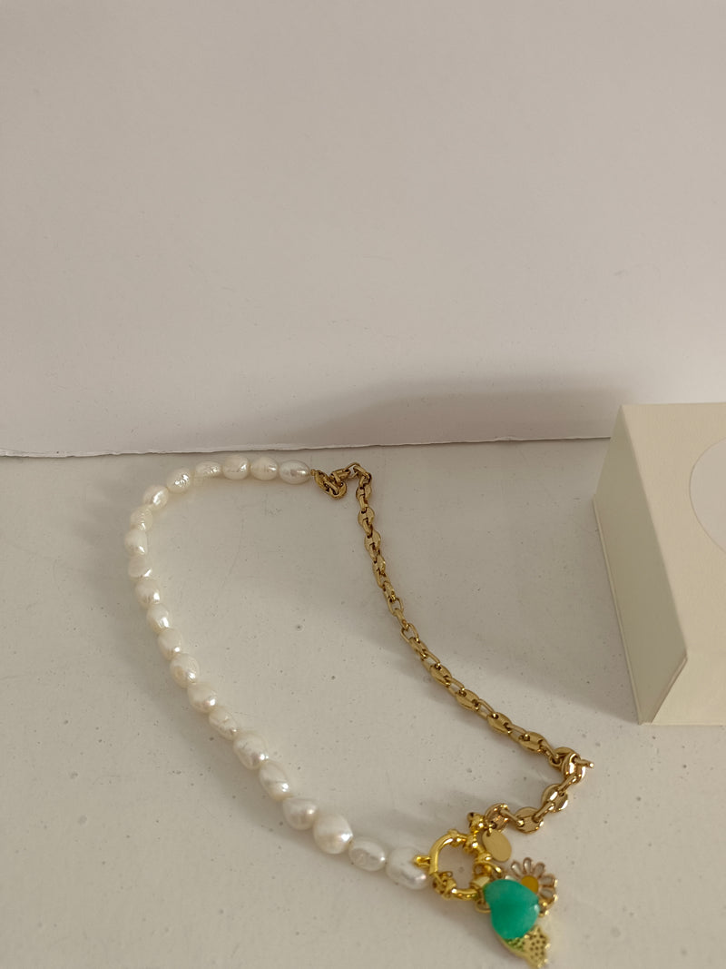 Collar de perlas y cadena dorada con abalorios