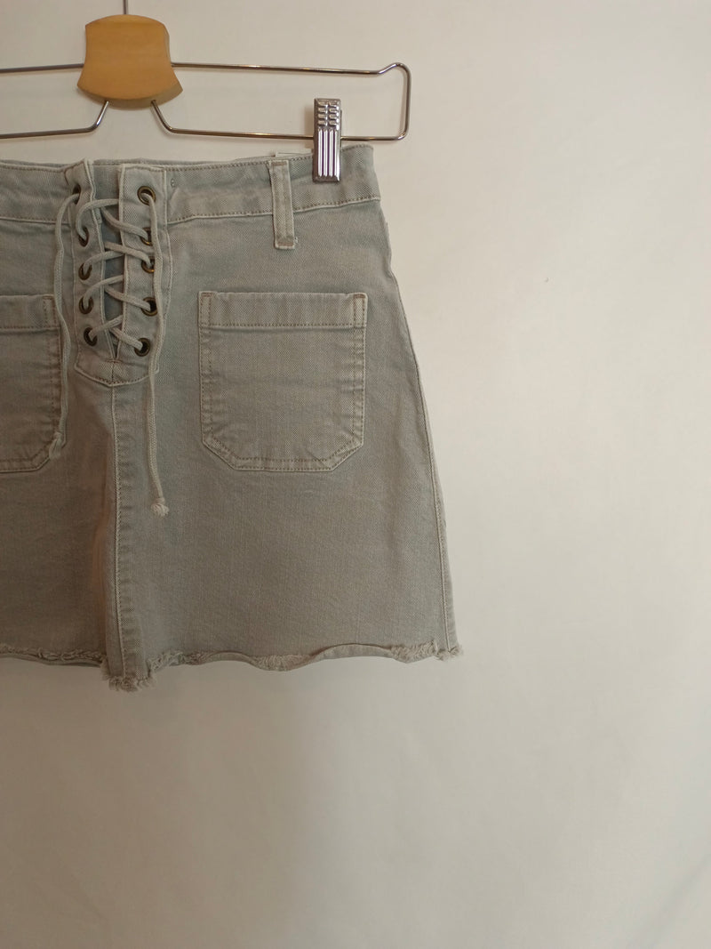 Falda vaquera gris con detalle de cuerdas.