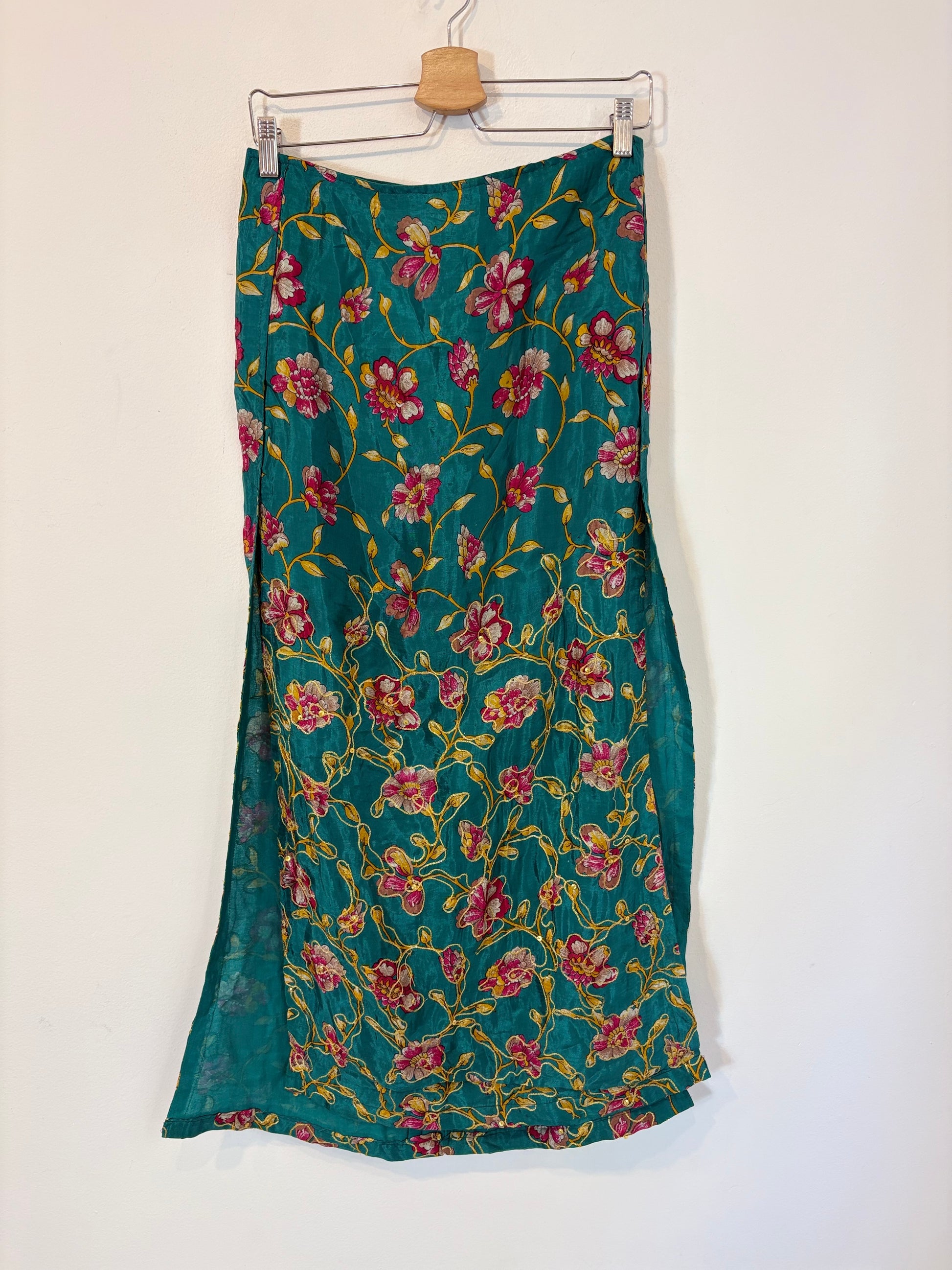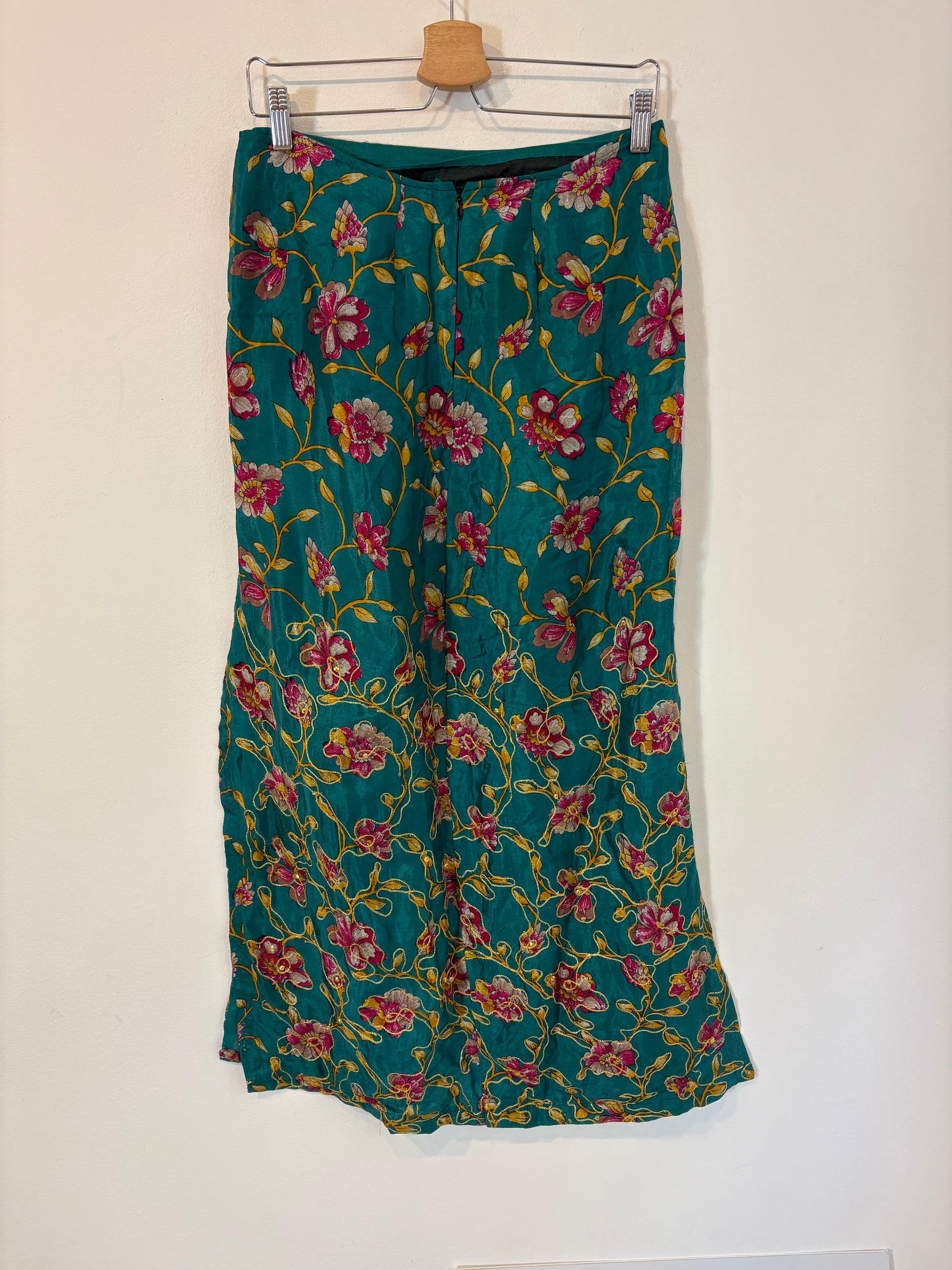 Falda larga verde flores bordadas. Parece seda pero tiene la etiqueta cortada. Cintura 38 cm y largo 95cm. No elástica con cremallera trasera