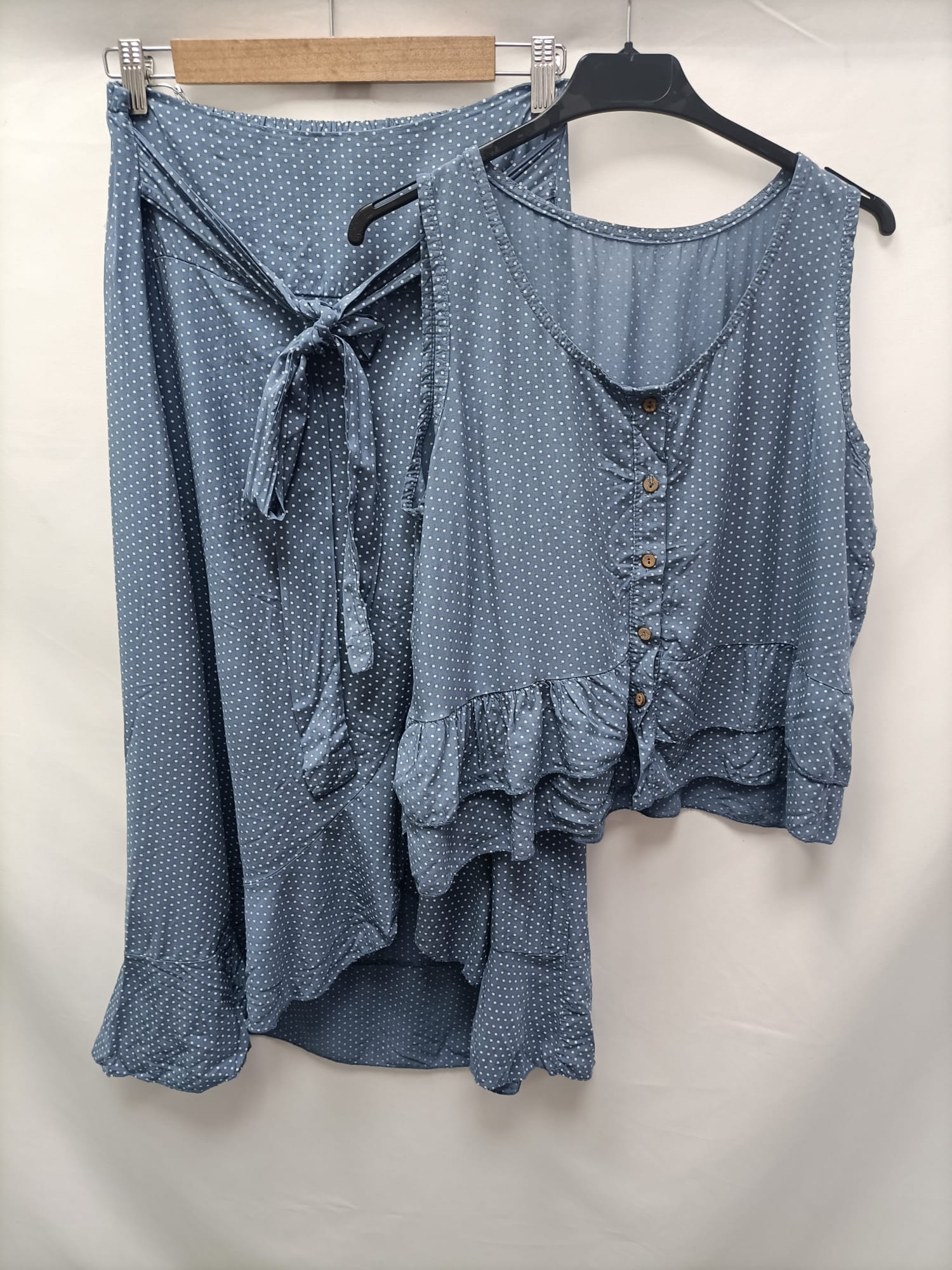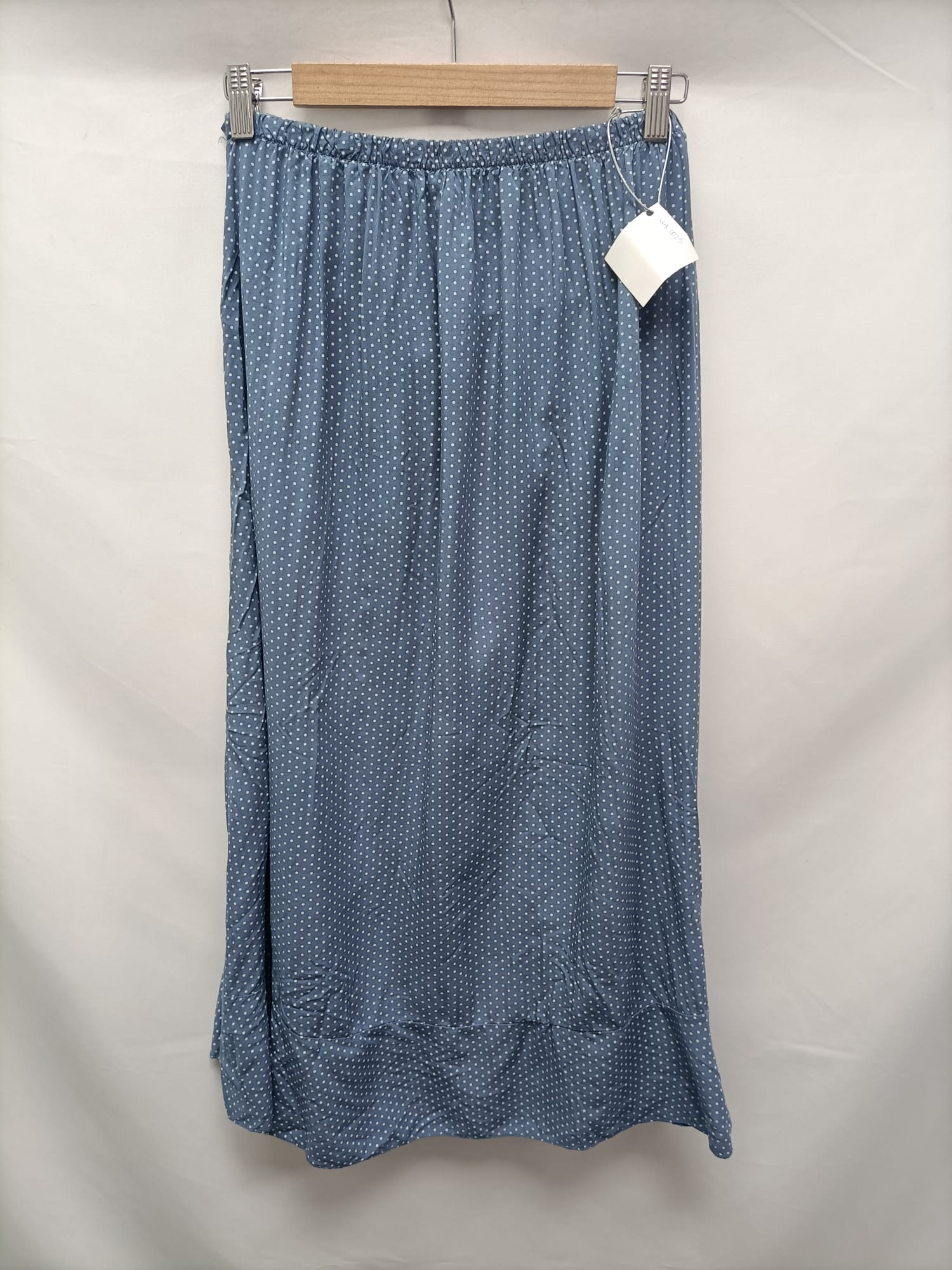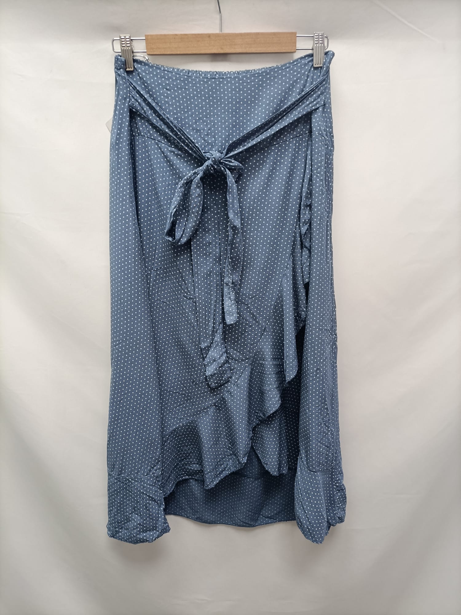 Falda midi azul con lunares blancos, es cruzada y con volantes, tiene una lazada para ajustar a la cintura que es elástica