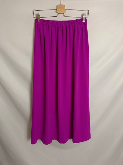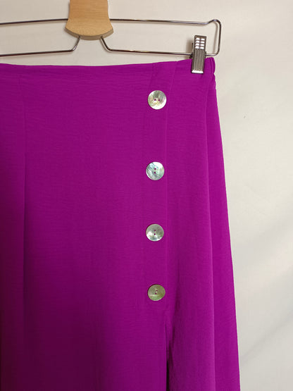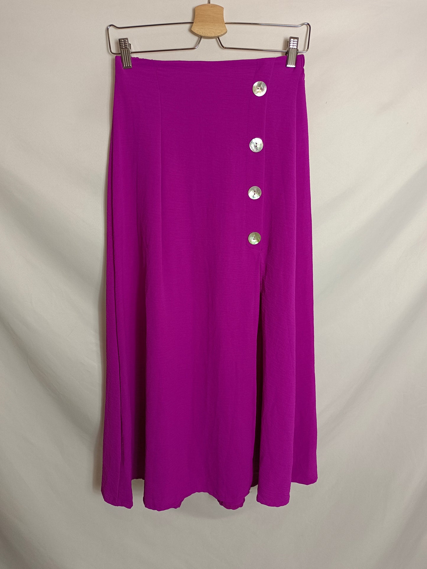 Falda midi color buganvilla con la cintura elástica. Apertura delantera y botones de adorno