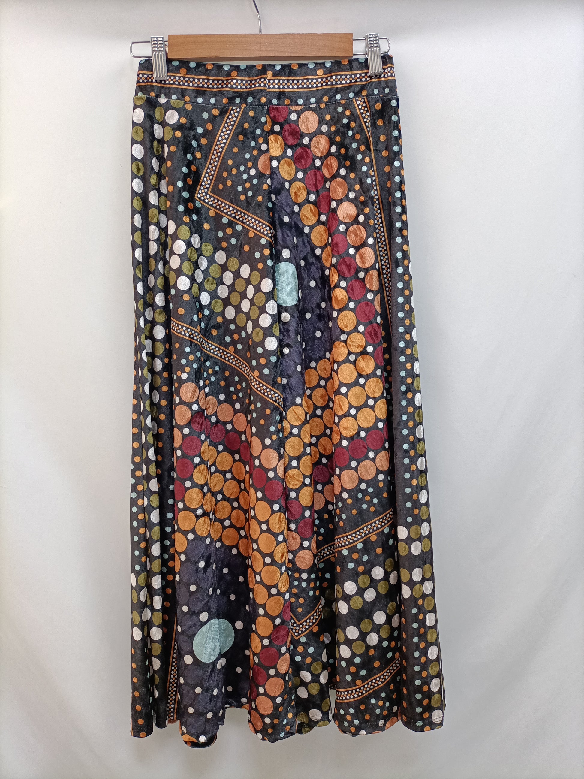 falda midi negra de terciopelo con estampado de lunares de colores. elástica. largo 88 cm