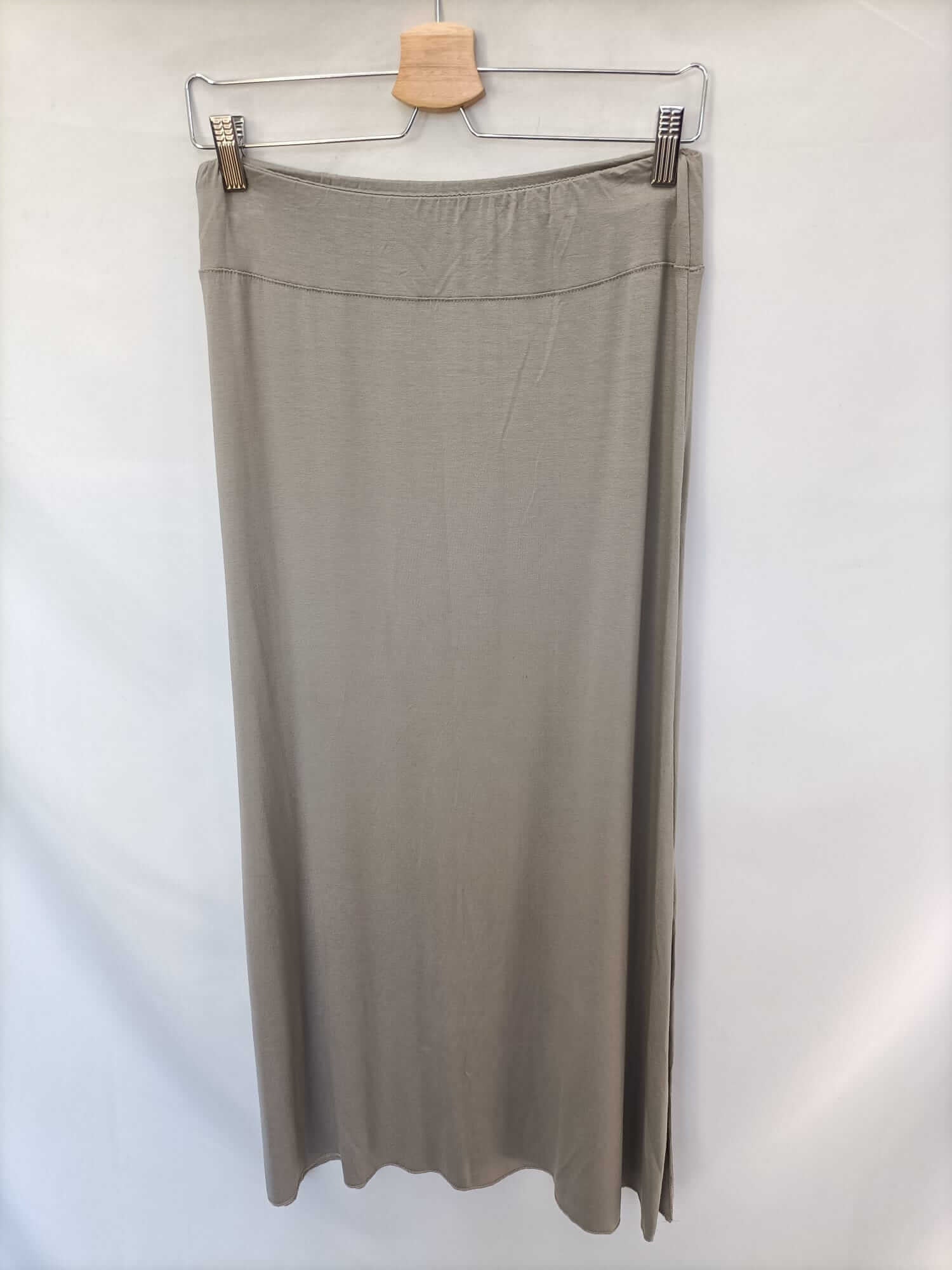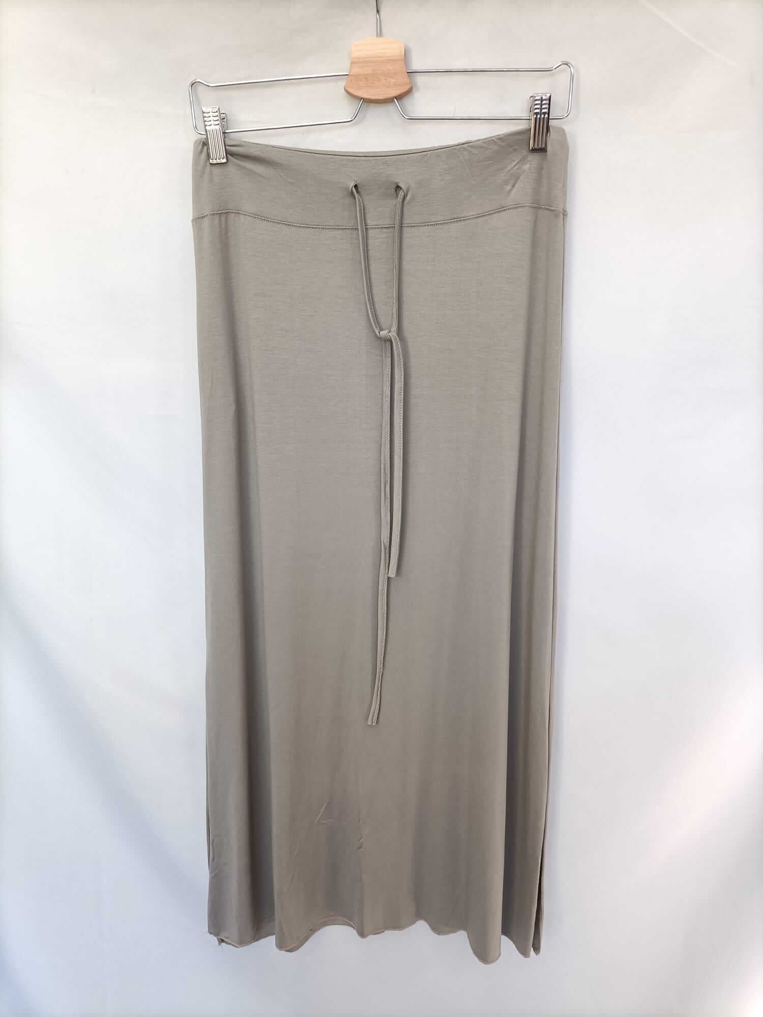 Otras. Tu. Falda tobillera gris topo. Elástica y ajustable en la cintura. Tienes aperturas laterales. Largo 96 cm