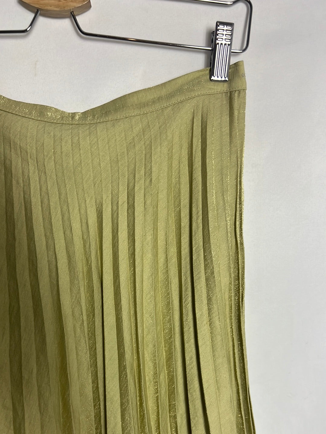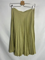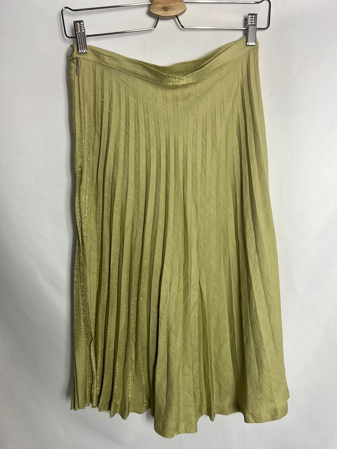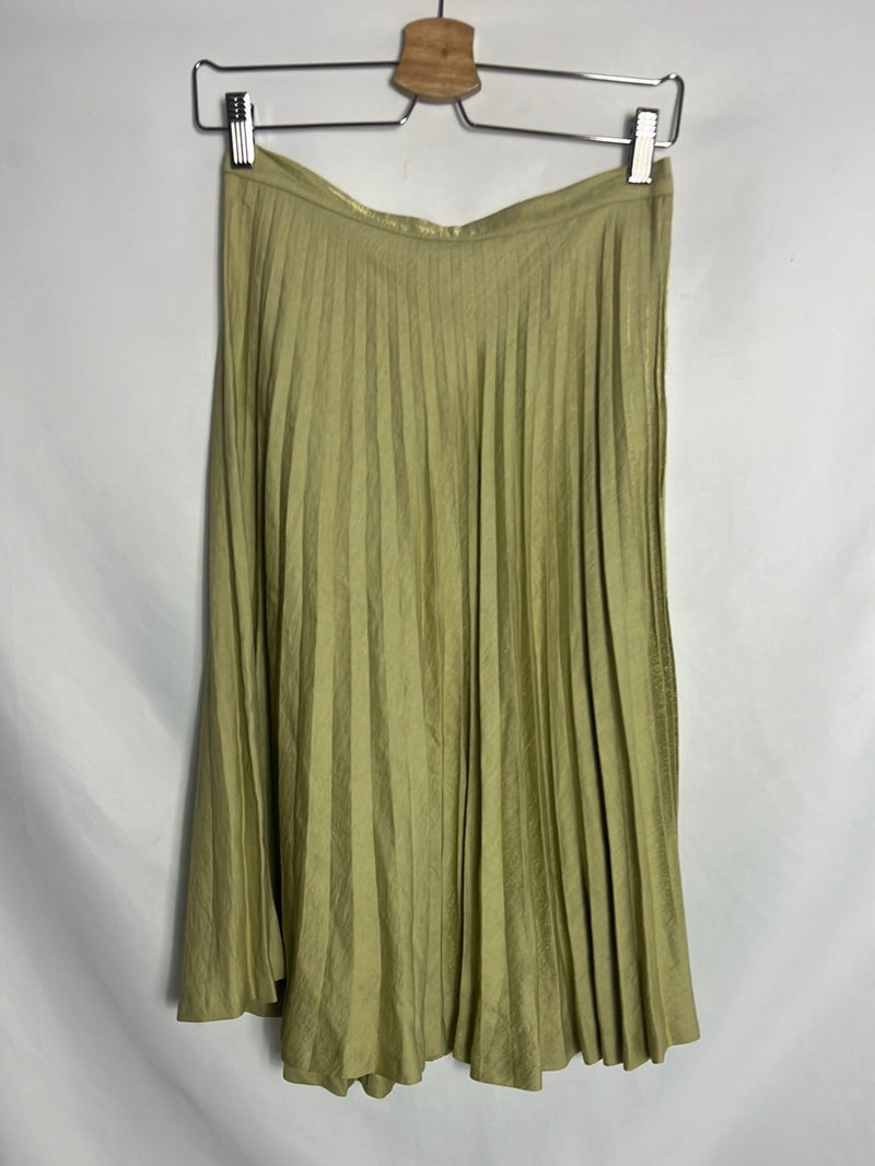 Falda plisada midi verdosa tonos dorados. Cintura 34cm y largo 71cm. Talla como una xs/s