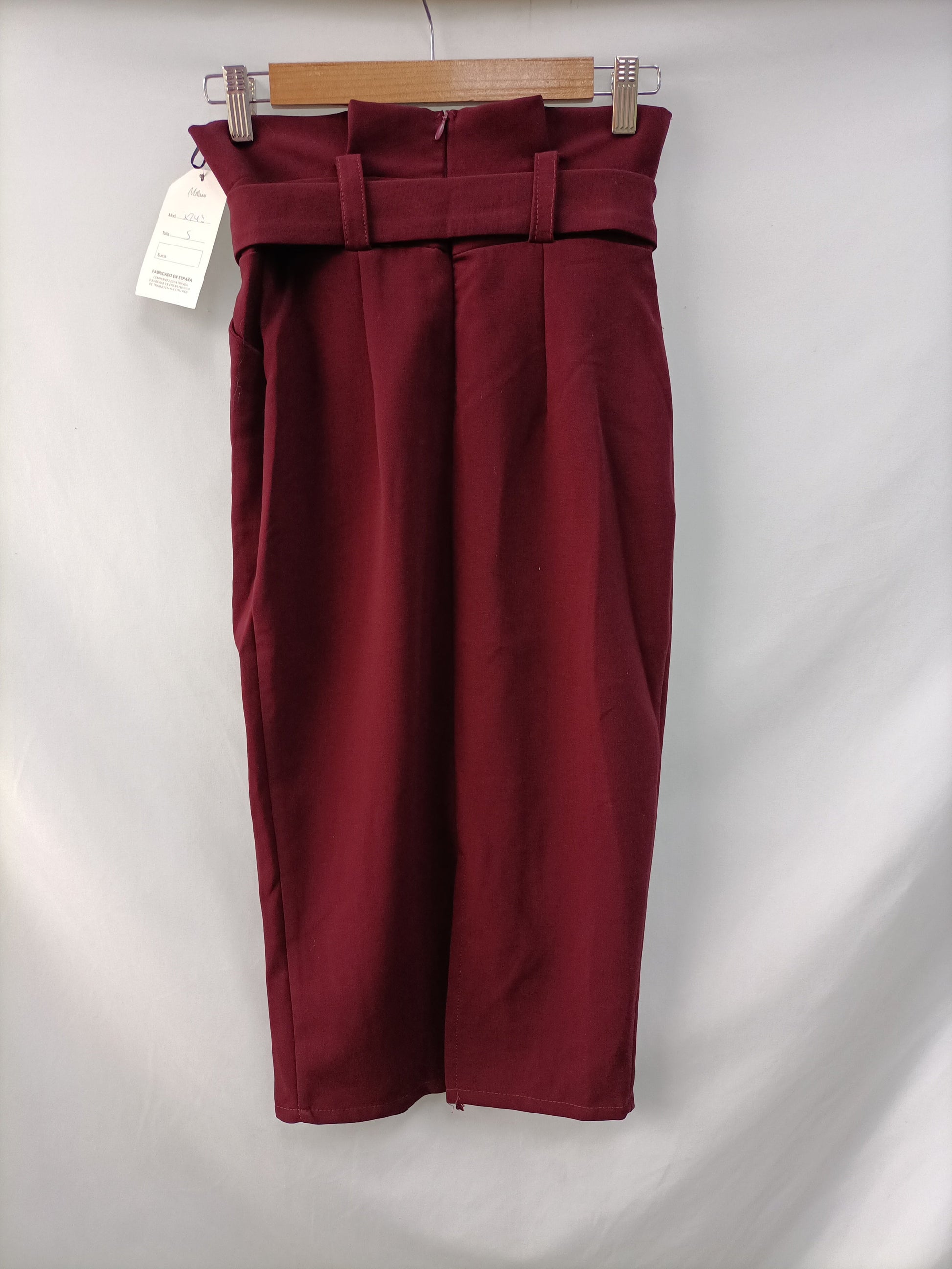 Falda midi burdeos de cintura alta y con cinturón incorporado. Se abrocha con cremallera por detrás y es semielástico . NUEVA CON ETIQUETA