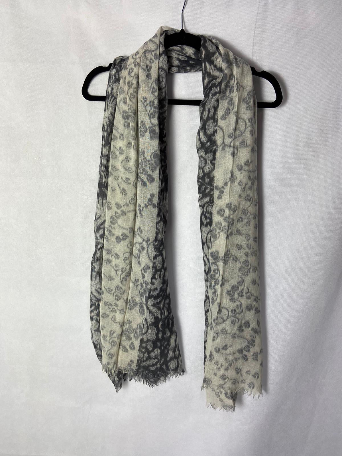 Fular gris y beige con estampado de flores tipo enredadera.