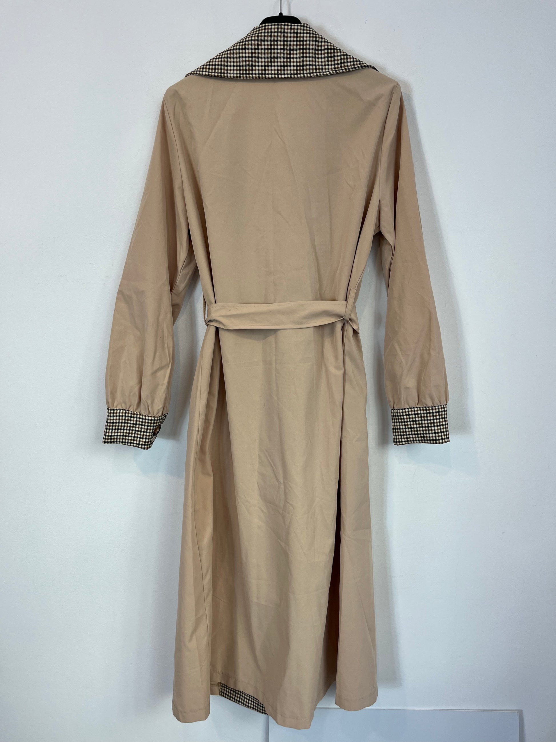 Gabardina beige larga con detalle de de cuadros en solapa y mangas. Fluida y ligera. largo 118 cm.